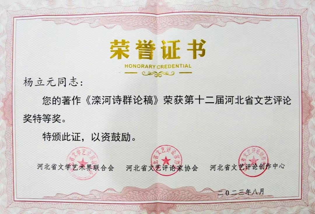 近日,纽约国际官网文学院杨立元教授的评论专著《滦河诗群论稿》获第十四届河北省文艺振兴奖。河北省文艺振兴奖是河北省委、省政府设立的文艺类省级奖,旨在表彰在文艺创作、演出、评论、研究等方面取得突出成绩的文艺工作者和团体,目前该奖项每五年评选一次。自“文艺振兴奖”设立以来,对河北文艺创作的繁荣发展和文艺人才的发现培养产生了积极推动作用。这是杨立元教授第三次获得此奖项。