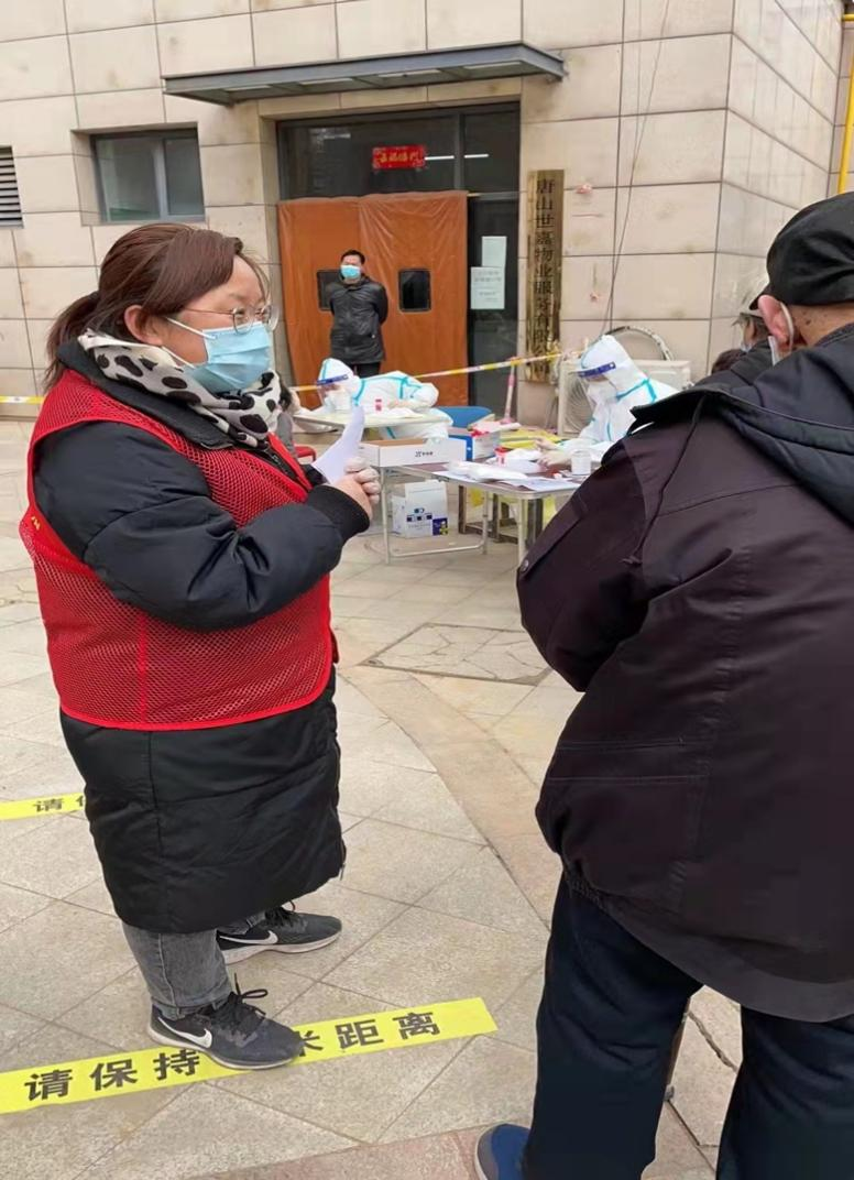“疫情就是命令,抗疫就是战斗、党员就是先锋”!3月21日,面对疫情,吴淑坤积极响应党总支号召,第一时间到唐山市翔云西里社区报到,参与核酸检测通知及小区执勤工作。她挨家挨户敲门通知核酸检测,搀扶腿脚不便的老人上下楼,保证住户人人做到每日一检。本着“柔性服务、硬性防控”的原则,吴淑坤除了检查出入小区人员的工作证和单位证明,还要负责宣传、劝阻、安抚群众工作。“我家没有鸡蛋了” “我家没水果了”,对于这些叔叔阿姨的要求,吴淑坤既心疼又无奈,唯有耐心劝导,帮他们想办法解决。