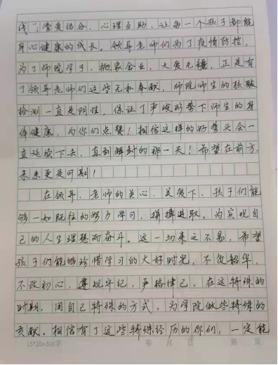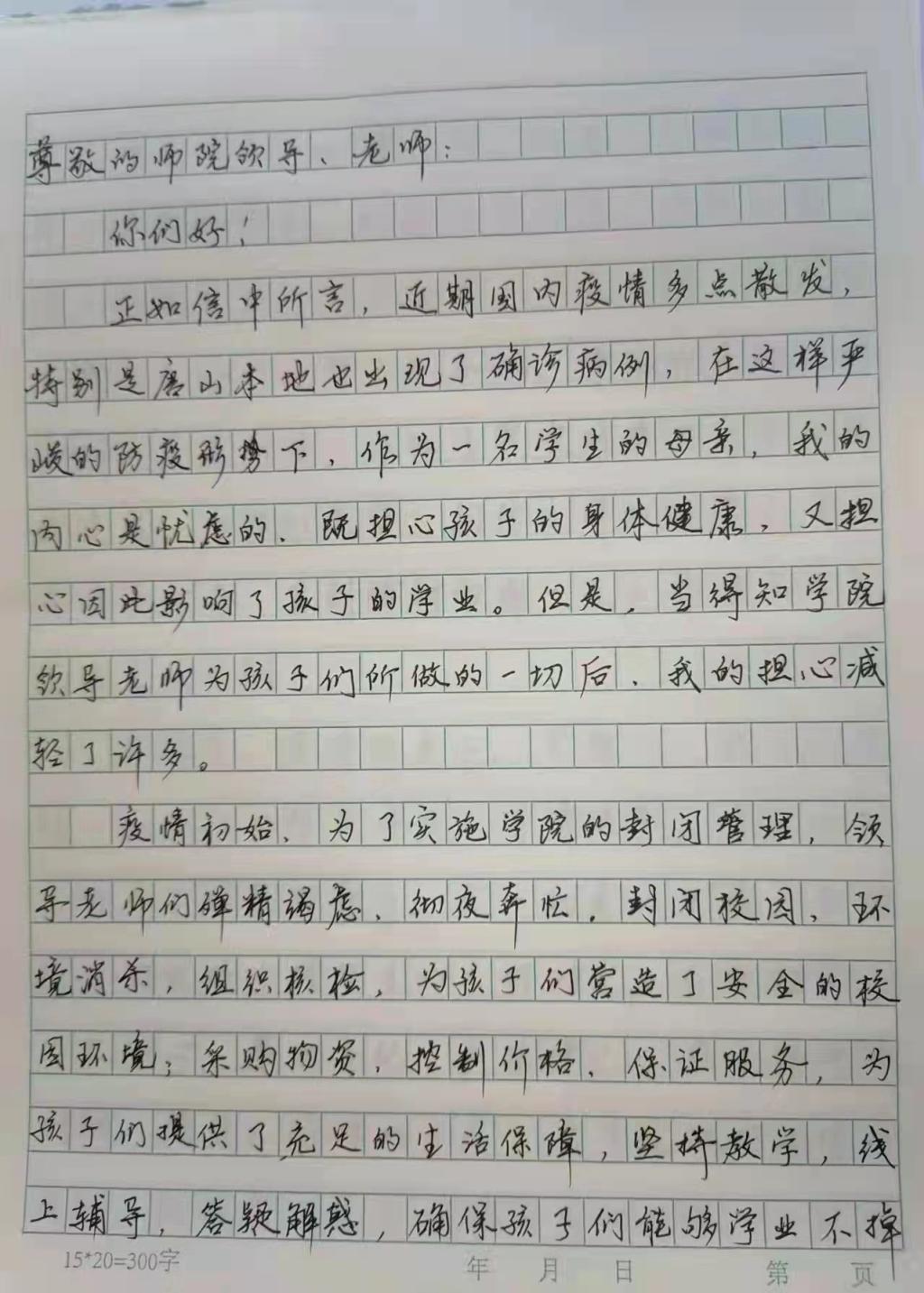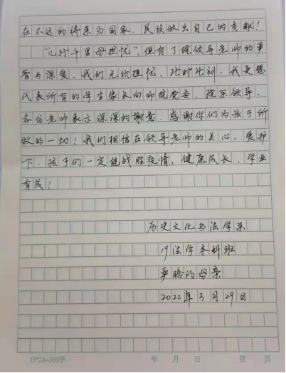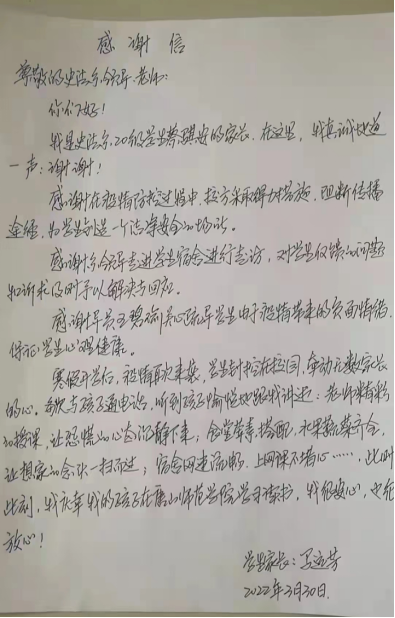 自唐山疫情爆发以来,纽约国际967线路测试立刻实行全封闭管理,保护师院师生的安全。3月22日,党委宣传部发布了致全校师生的一封信。对此,一些学生家长以各种方式纷纷发来了回信。