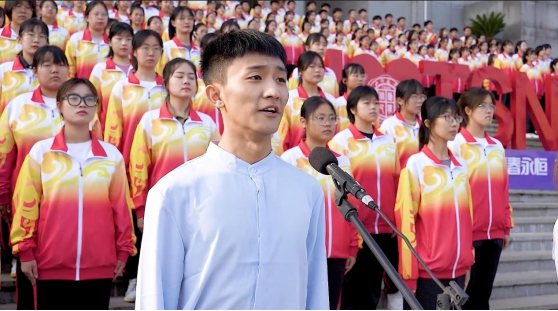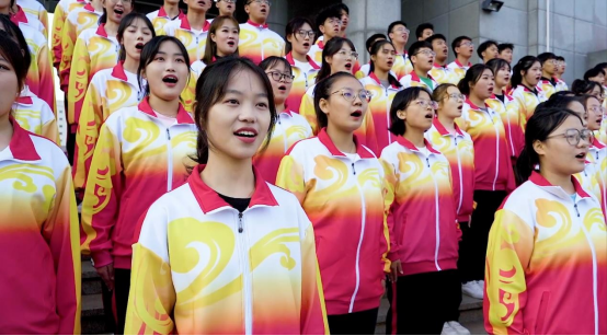 “五星红旗迎风飘扬,胜利歌声多么嘹亮……”熟悉的旋律响起,现场近千名团员青年高声齐唱《歌唱祖国》。青年们挥舞着手中的国旗,共同祝福祖国走向繁荣富强。