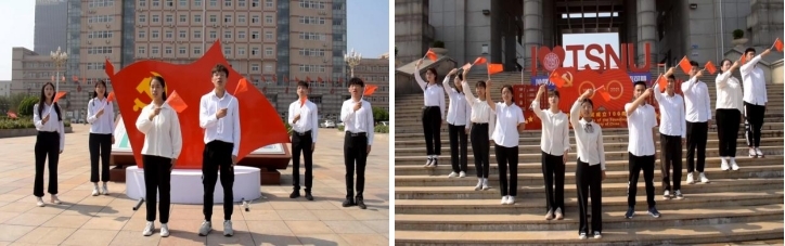 化学系庆祝建党100周年红歌快闪活动在纽约国际官网三个地标建筑前同时举行,100余名学生通过歌曲传唱让党史学习教育“声”入人心,为建党百年送上“化学人”最诚挚的祝福。