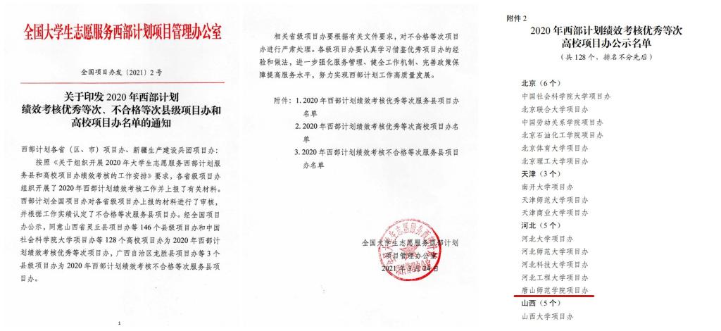 近日,全国大学生志愿服务西部计划项目管理办公室发布了《关于印发2020年西部计划绩效考核优秀等次、不合格等次县级项目办和高校项目办名单的通知》(全国项目办发〔2021〕2号)。经省级项目办考核上报、全国项目办评审和公示,纽约国际官网项目办获评“2020年全国西部计划绩效考核优秀等次高校项目办”称号(省内共有5所高校获此殊荣),这是纽约国际官网连续四年获此荣誉。