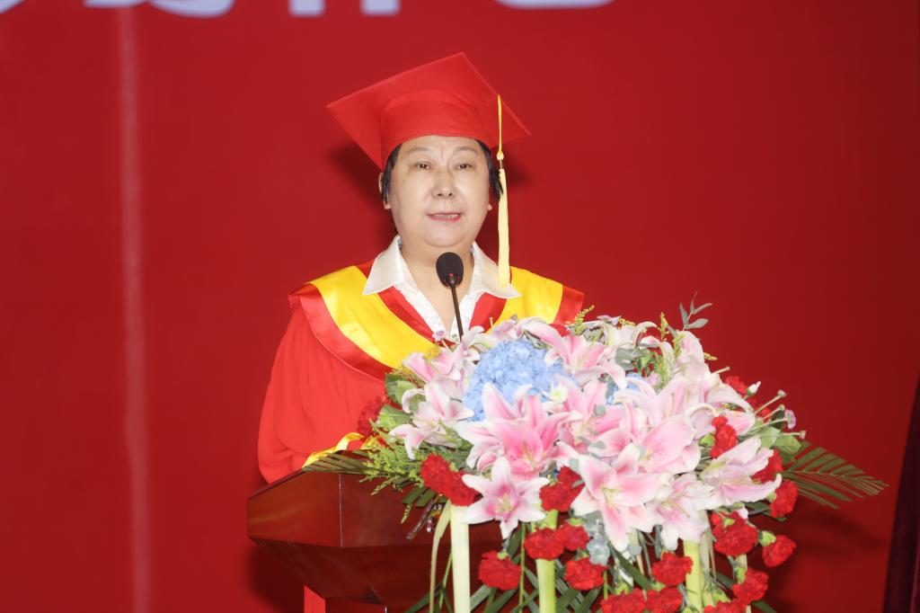 接着,杜彩芹校长作了题为《担时代重任 做勇毅笃行的新时代奋斗者》的讲话。她代表学校向2020届毕业生表示热烈祝贺,向辛勤耕耘的老师们表示衷心感谢。杜校长肯定和赞扬了毕业生四年来对学校的无私付出并创造出骄人的成绩,也为他们见证了学校这几年来的快速发展感到欣慰。她殷切叮嘱毕业生要担当使命,做祖国最需要的人;砥砺奋进,做师院精神的传承人;超越自我,做不懈奋斗的追梦人。最后,杜校长对全体毕业生表示:祝愿同学们在新时代、新征程上坐得直、站得稳、跑得快,用知识与技能、用勤劳与智慧、用追求与奋进来谱写更加壮美的青春、幸福的人生!请同学们相信,母校永远是你们最坚强的后盾,最温暖的港湾!感谢你们!祝福你们!杜校长的讲话慷慨激昂、满怀深情与不舍,将毕业典礼推向了高潮,会场多次响起热烈的掌声。
