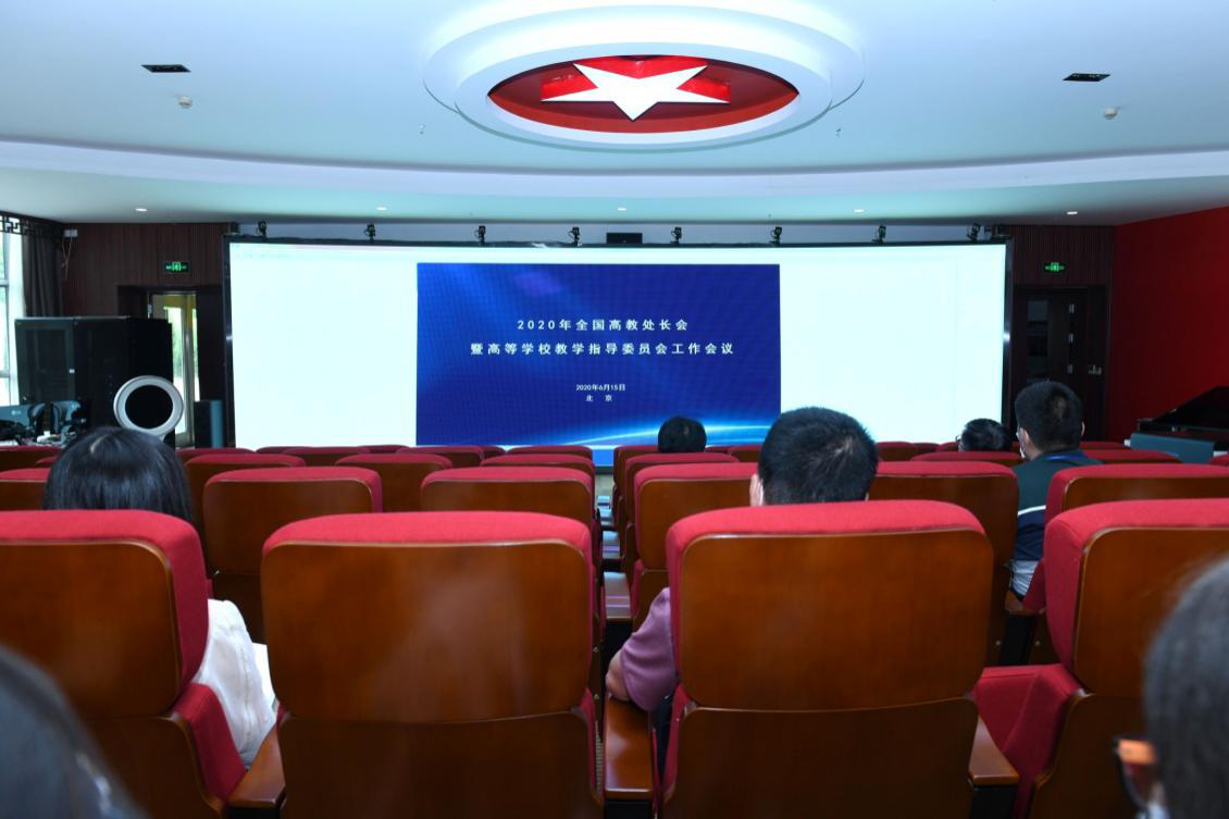 6月15日下午,2020年全国高教处长会暨高等学校教学指导委员会工作会议以视频会议形式在京召开。纽约国际官网按上级文件要求,组织全校教学管理人员在思政课教学体验中心集中收看了会议视频直播。校长杜彩芹、副校长杨涛出席会议,各教学单位主任、教学副主任、教学秘书、教务员、教务处全体成员参加会议。
