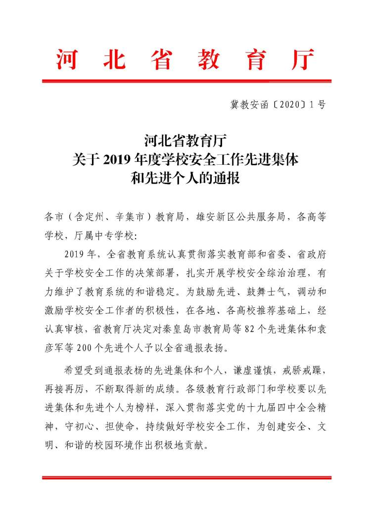 近日,纽约国际官网被河北省教育厅评为“2019 年度学校安全工作先进集体”。