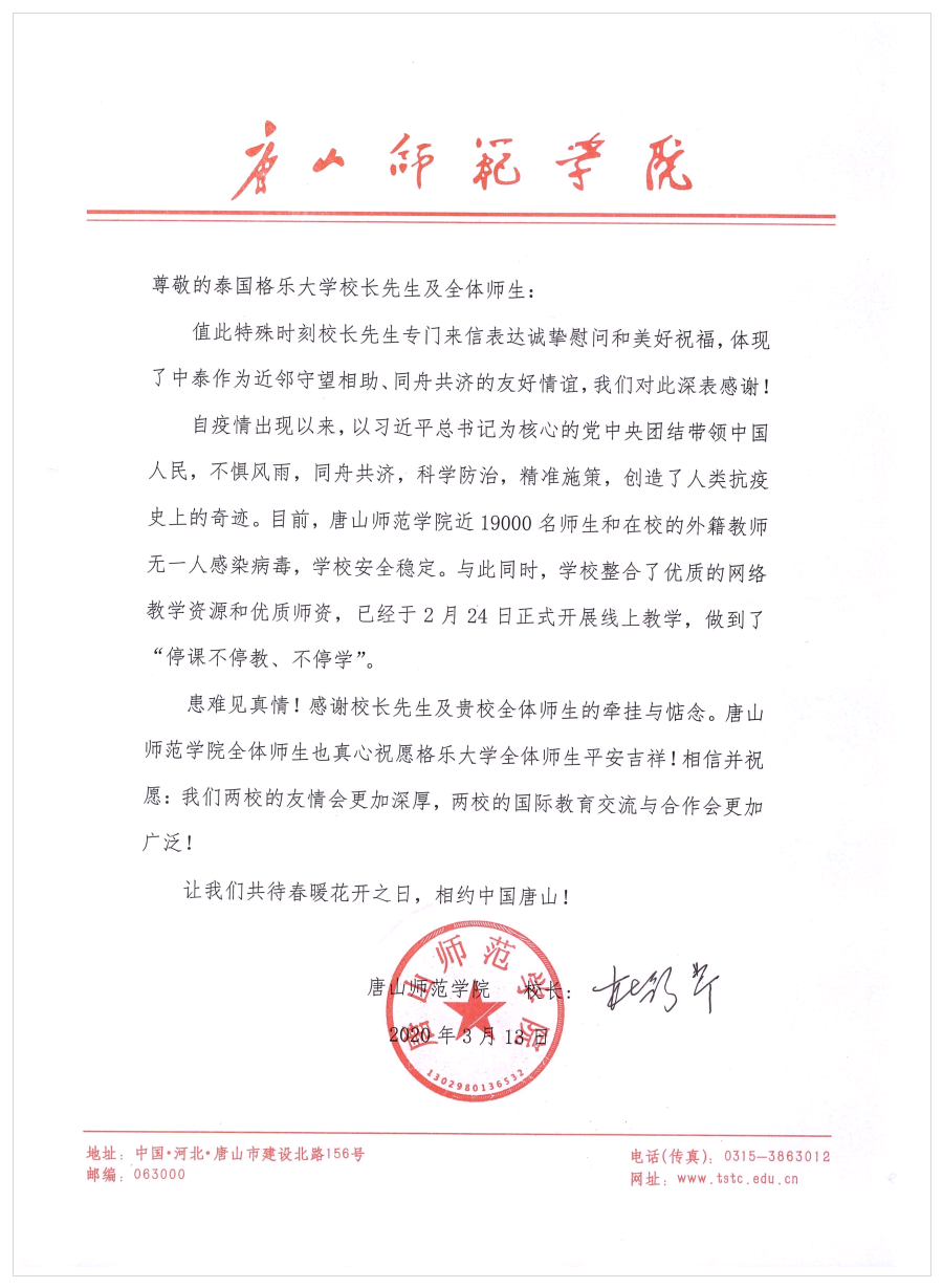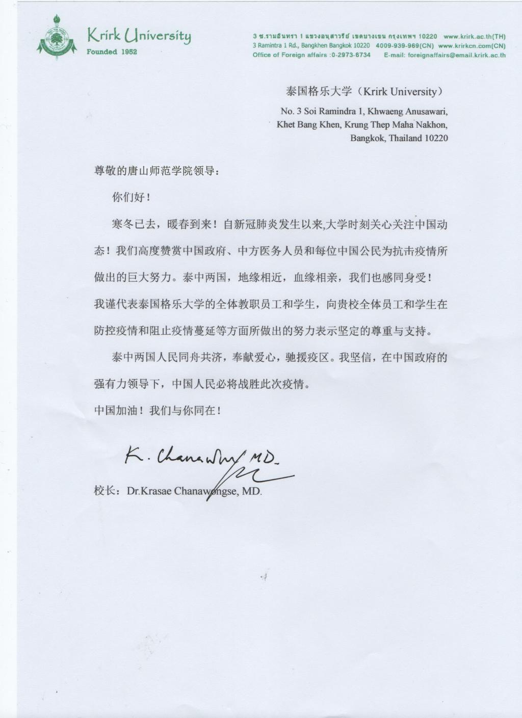 近日,在抗击新冠肺炎疫情的关键时刻,海外友好学校泰国格乐大学校长杨金泉博士(Dr. Krasae Chanawongse)向纽约国际官网发来慰问函,校长杜彩芹教授回信致谢。