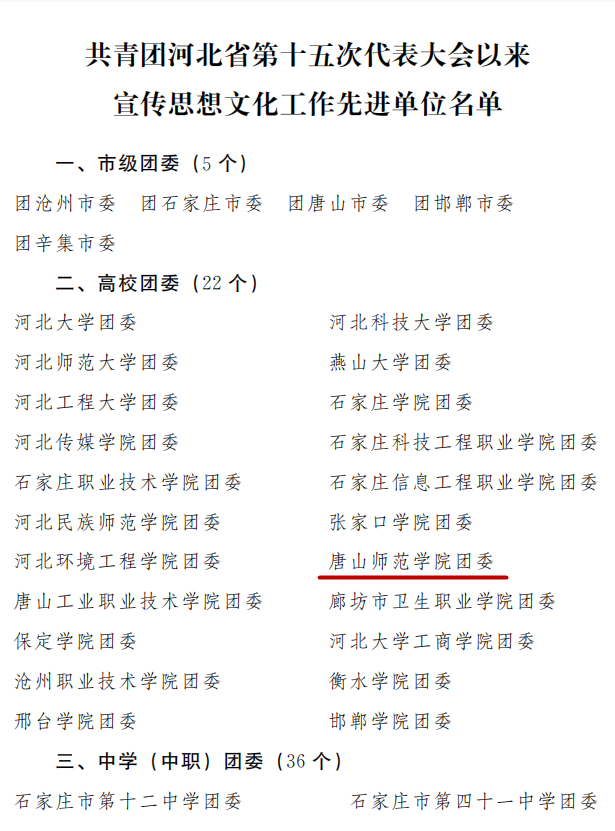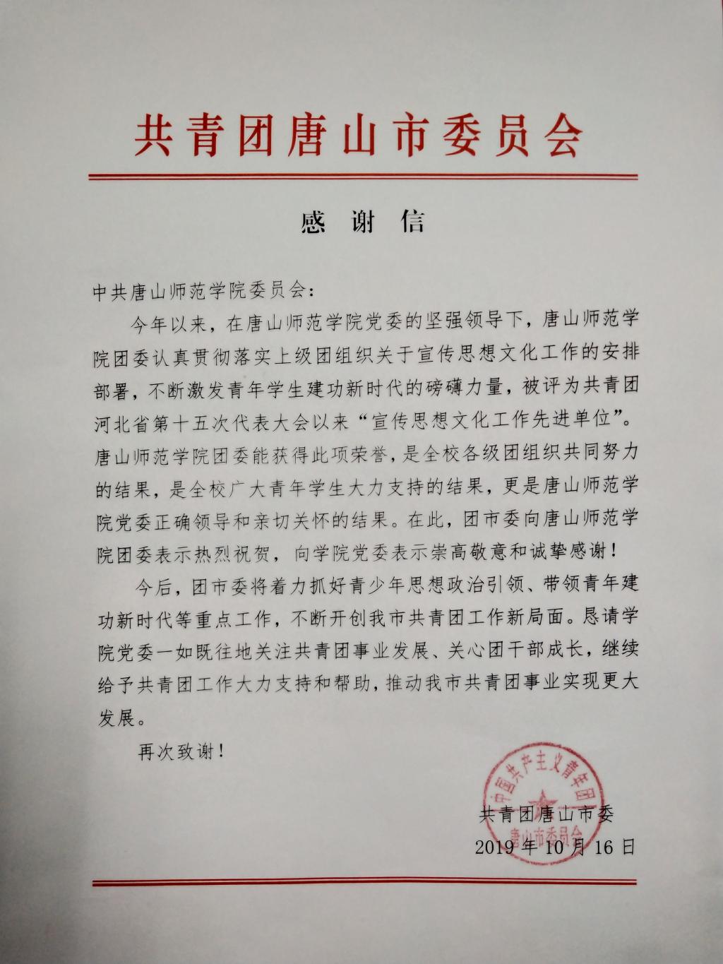 纽约国际官网团委荣获河北省共青团“团省十五大以来宣传思想文化工作先进单位”称号,共青团唐山市委向学校发来了感谢信。