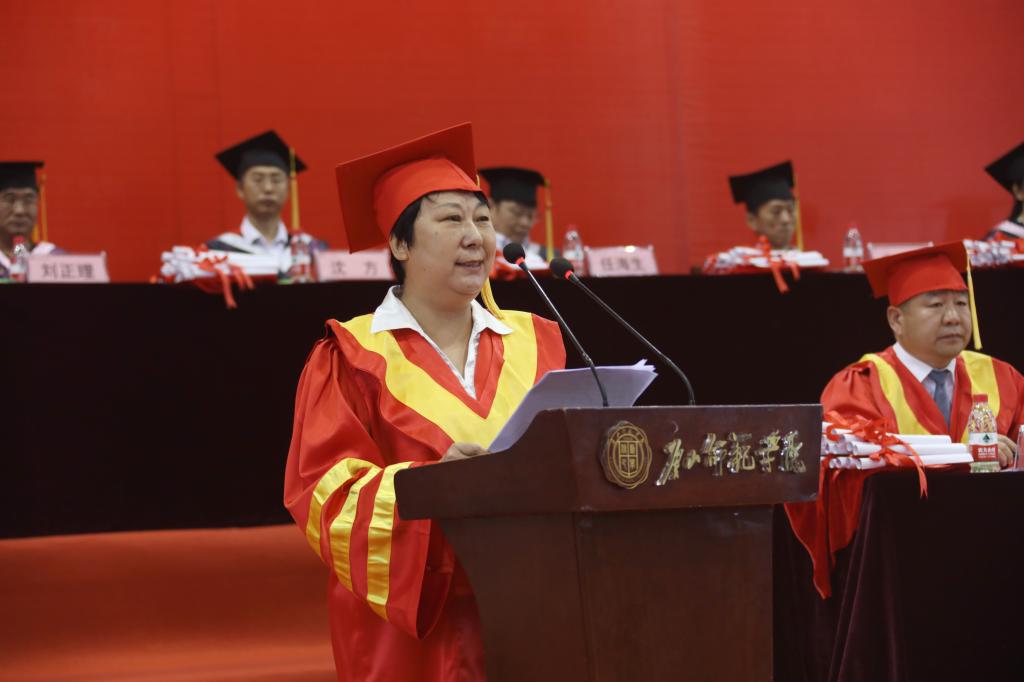 毕业生代表和教师代表相继发言。化学系本科毕业生侯天文,代表全体毕业生向辛勤培育他们的领导和老师表达了崇高的敬意,表示要牢记校训,努力为母校争光。随后,数学与信息科学系王朝霞教授,代表全体教师向顺利完成大学学业的毕业生表示衷心祝贺,谆谆叮嘱毕业生要懂得感恩,珍惜四年大学生活中的老师和同学;继续扎实学习、踏实前进;完善人生规划,创造美好未来。