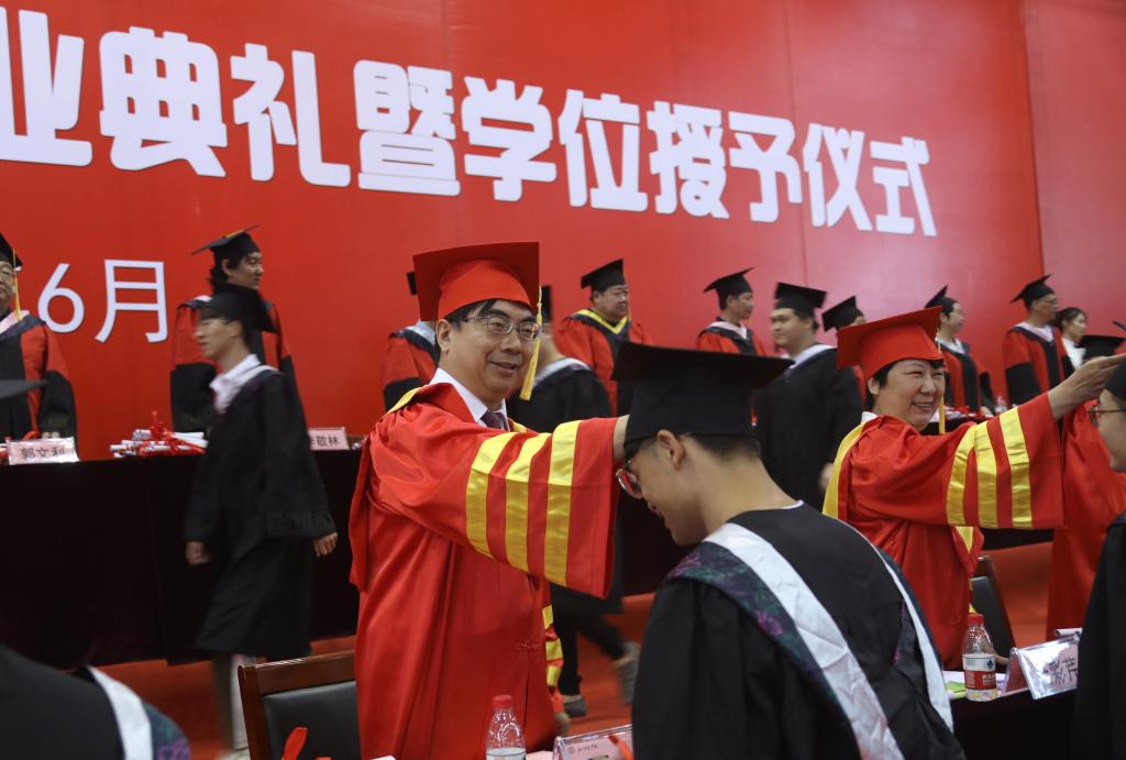 毕业典礼结束后,举行了本科生学士学位授予仪式。校领导与主礼教授们为每位本科生正冠拨苏、授予学位。
