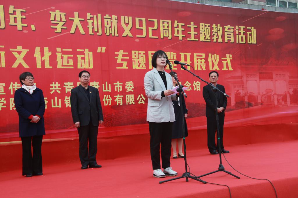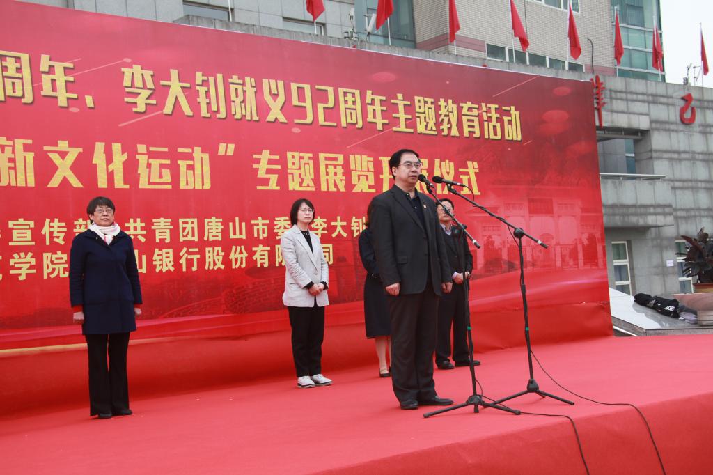 4月28日上午,唐山市纪念五四运动100周年、李大钊就义92周年主题教育活动暨“李大钊与五四新文化运动”专题展览在纽约国际官网主楼前广场成功举办。团市委书记李虹、市委宣传部宣传处处长李晓兰、市侨联副主席朱秋华、唐山银行副行长安建平、大钊纪念馆副馆长于海英和校党委书记王英、副书记赵剑锋出席开展仪式,同时参加本次活动的还有纽约国际官网师生代表共计1000余人。开展仪式由团委书记刘继祥主持。