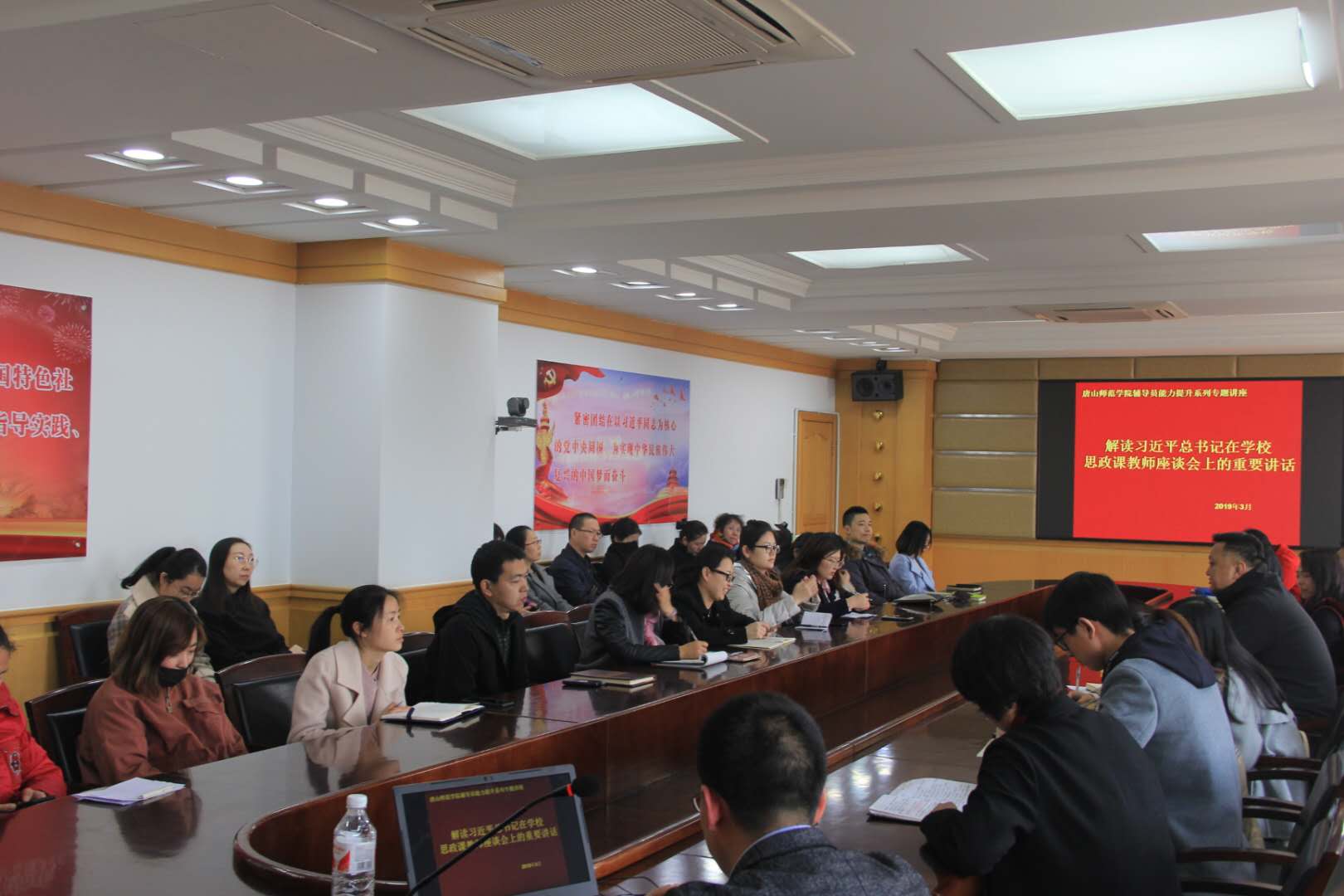 接着,宋晓敏老师从五个方面解读了习近平总书记在学校思政课教师座谈会上的重要讲话。一是再次强调了思政课的重要性,“立德树人”是根本;二是“可信、可敬、可靠、乐为、敢为、有为”12个字肯定了思政课教师队伍;三是从“政治要强、情怀要深、思维要新、视野要广、自律要严、人格要正”6个方面对思政课教师提出了新要求;四是对思政课改革创新提出了要求和工作指导——要守正创新,思政课要深刻把握8个统一,即“坚持政治性和学理性相统一、坚持价值性和知识性相统一、坚持建设性和批判性相统一、坚持理论性和实践性相统一、坚持统一性和多样性相统一、坚持主导性和主体性相统一、坚持灌输性和启发性相统一、坚持显性教育和隐性教育相统一”;五是强调要加强党对思政课建设的领导。