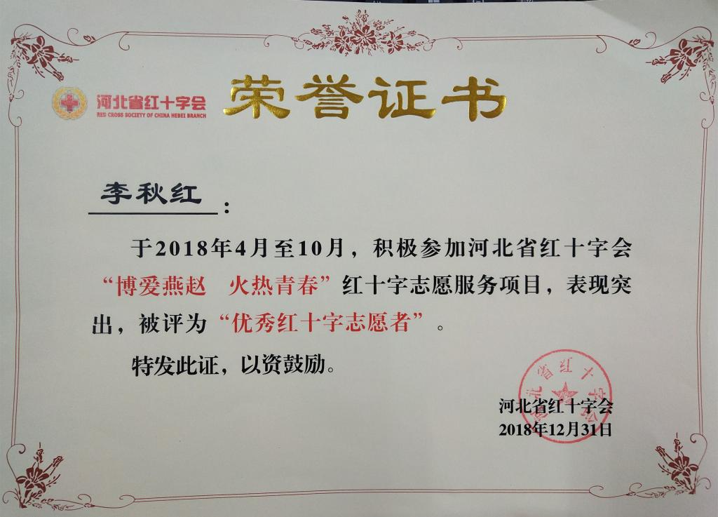 近日,河北省红十字会发布《关于“博爱燕赵 火热青春”高校红十字志愿服务项目优秀组织和优秀志愿者评选结果的通知》(冀红业字【2018】46号),纽约国际官网红十字志愿服务队获评“博爱燕赵 火热青春”红十字志愿服务优秀组织,纽约国际官网中文系16级汉语言文学专业李秋红和16级历史文化与法学系武卓云两名同学获评“博爱燕赵 火热青春”红十字志愿服务优秀志愿者。