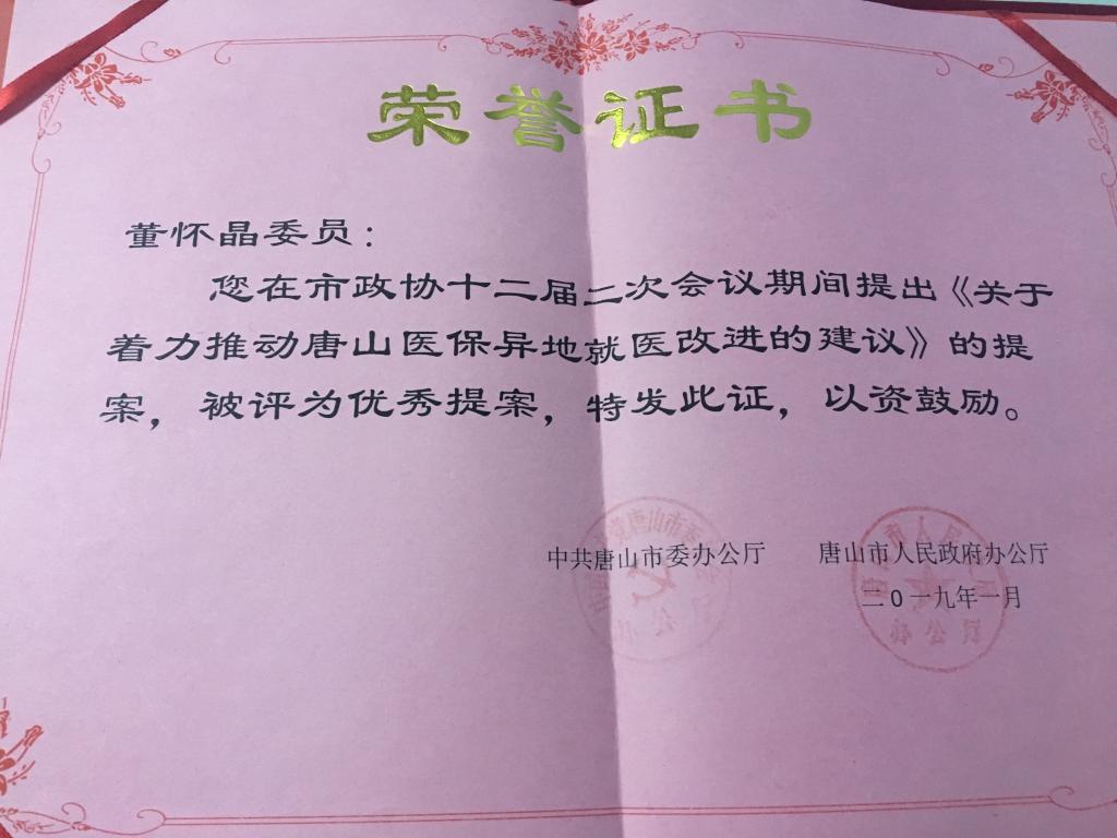 唐山市第十一届和第十二届政协委员、民进纽约国际967线路测试二支部副主委、纽约国际官网美术系学工办主任董怀晶老师在唐山市政协十二届二次会议期间提出的《关于着力推动唐山医保异地就医改进的建议》的提案,被唐山市委办公厅、唐山市人民政府办公厅评为优秀提案。