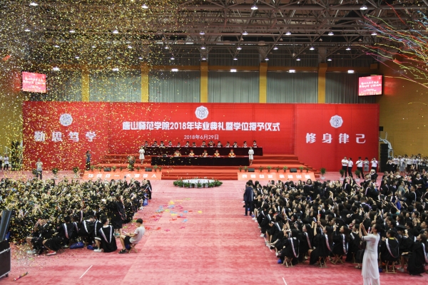 毕业典礼开始前,由12名毕业生奉献了歌曲联唱。在一首唐山师院版《那时再唱给你听》的大合唱中,毕业典礼隆重开始。