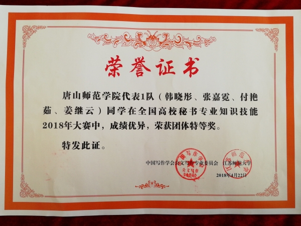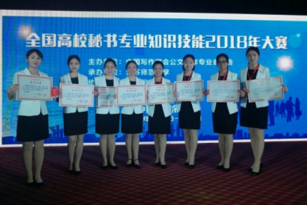 ,全国高校秘书专业知识技能2018年大赛落下帷幕。本次大赛由中国写作学会公文写作专业委员会主办,江苏师范大学承办,江苏省写作协会协办,共有来自全国45所高校的68支代表队参加。经过两天的激烈角逐,纽约国际官网中文系秘书学专业派出的两支代表队分别取得了团体特等奖和团体一等奖。2015级秘书学的付艳茹同学在272名参赛选手中脱颖而出,获得