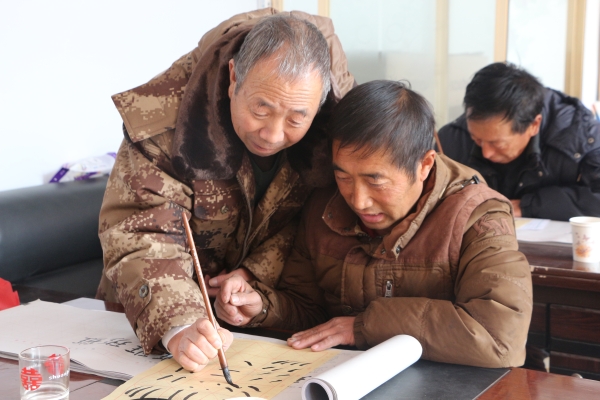 课上,张副院长和胡老师对学员在书法学习当中遇到的困难进行了细致讲解,并对学员进行了一对一辅导。张副院长还挥毫泼墨,为成绩优秀的学员亲自书写作品以资鼓励。他说:“看到大家的成绩和努力,我相信六合店村的学员们一定会把书法写好,为书法教育村的建设添砖加瓦,传承国学,弘扬文明,走出一条有自己特色的文化扶贫之路。”课后,张副院长还鼓励村民一定要勤于练习,为把六合店村建设成为名副其实的“中国书法教育村”贡献自己的力量。