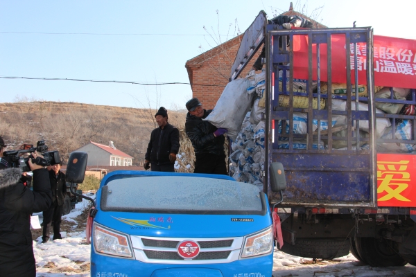 停在了围场县腰站镇六合店村的小广场上。车上挂着条幅:信美股份唐山分公司、唐山温暖爱心公益群为六合店村送温暖。村民们聚集在一起等待发放仪式的开始。