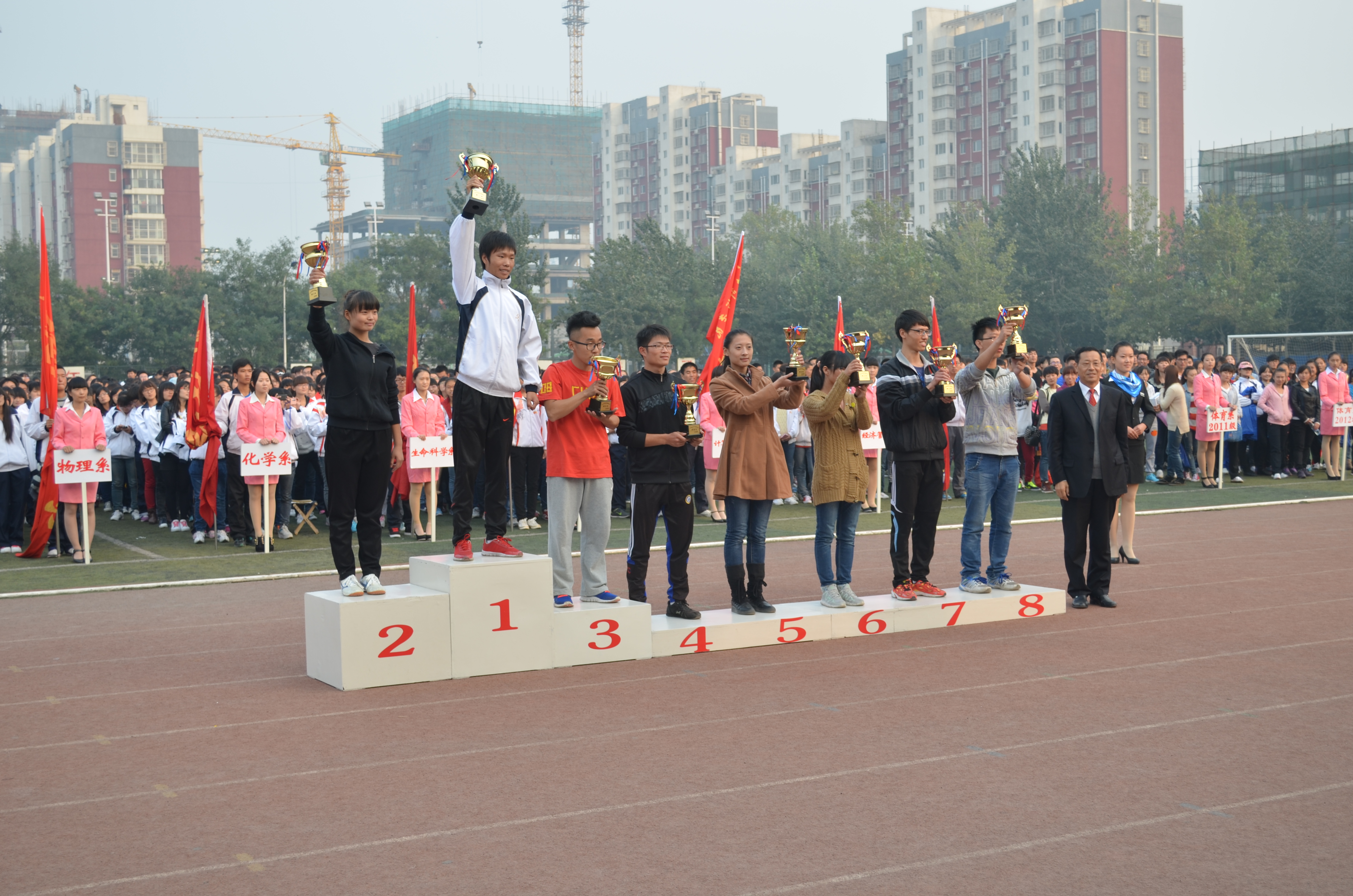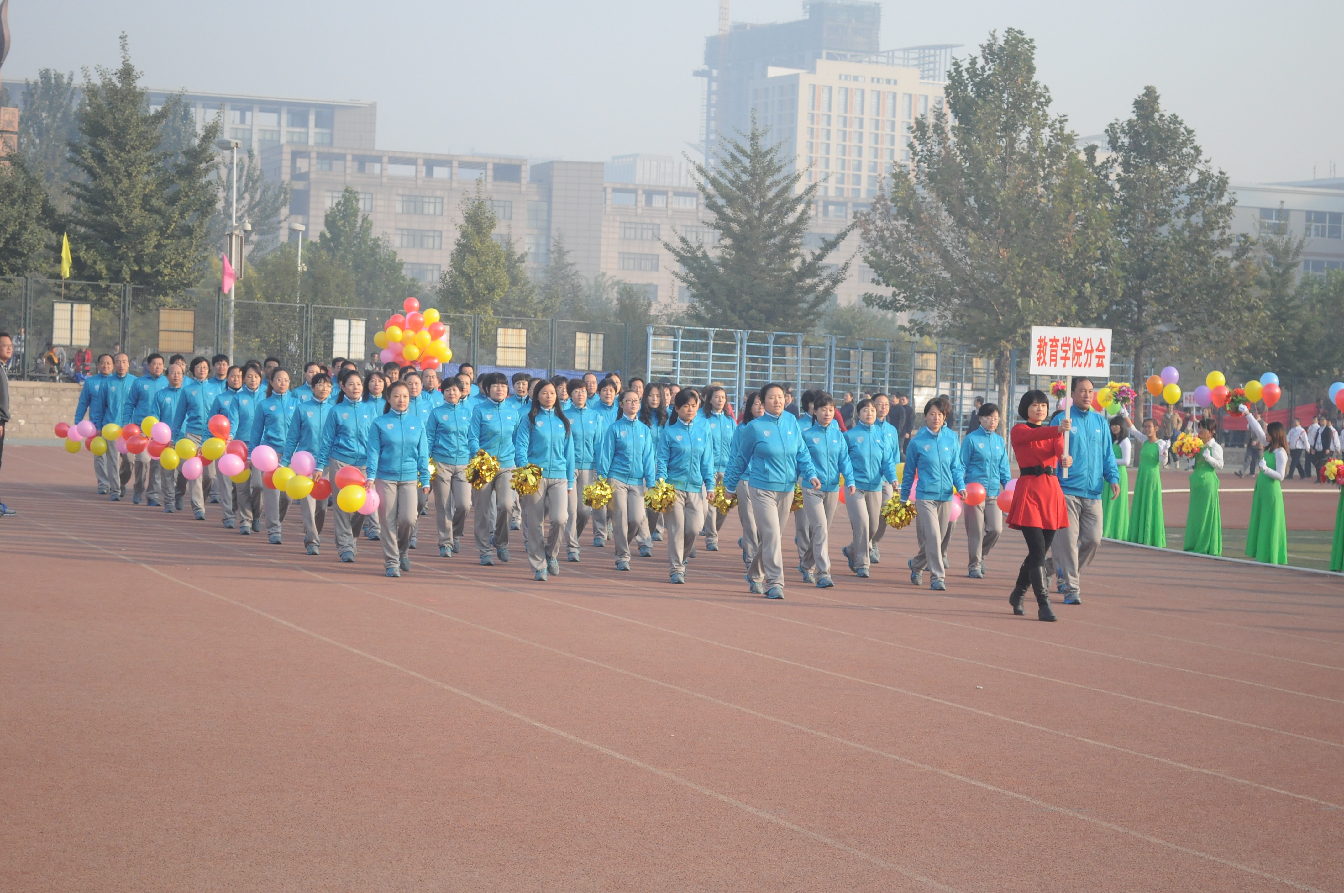 之后,党委副书记赵剑锋宣布比赛正式开始。宁静的校园顿时沸腾起来,此起彼伏的欢呼声、喝彩声、加油声不绝于耳。校园里最美的风景是运动场上每一位蓄势待发的运动员。他们各显身手,眼睛里流露出坚定的目光和必胜的信心。尤其引人注目的是教职工代表队队员,他们不甘示弱,奋勇拼搏,充分展现了教师的风采。身着蓝色制服的裁判员们尽职尽责,细心做好每个比赛项目的记录,以公平公正的态度为运动会服务。而各位啦啦队队员们也忙得不亦乐乎,有的为运动员送水,有的为运动员写稿加油助威。全校15个院系、19个分会共1058名运动员进行了75个项目的角逐,形成了师生广泛参与、全民健身的可喜局面。