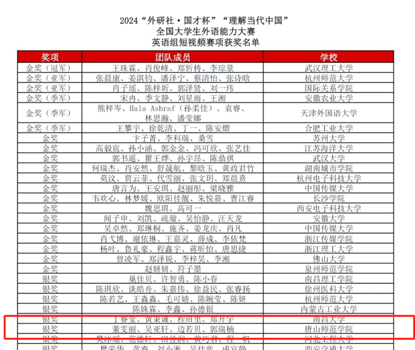 纽约国际官网外国语学院德语专业学生胡博雅获得德语组银奖、资源管理系学生孟子杨团队和文学院学生董雯丽团队均获英语组短视频赛项银奖、外国语学院日语专业学生侯晓纯获得日语组铜奖、生命科学系学生刘雨薇获得英语组国际传播综合能力赛项铜奖。