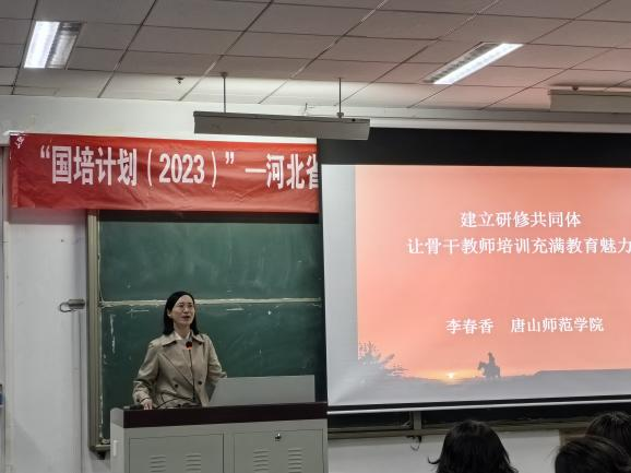 开班典礼之后,李春香为学员带来第一讲——建立研修共同体,让骨干教师培训充满教育魅力。她指出,一流的培训要育文化,要做有思想引领的培训、内容恰当的培训,并结合唐山地域特色介绍了本次培训课程安排及亮点。