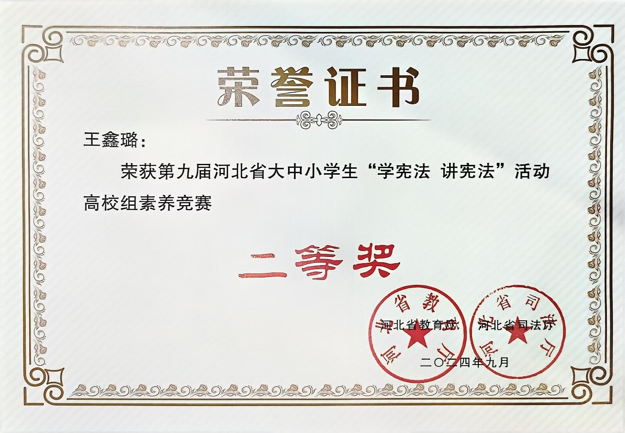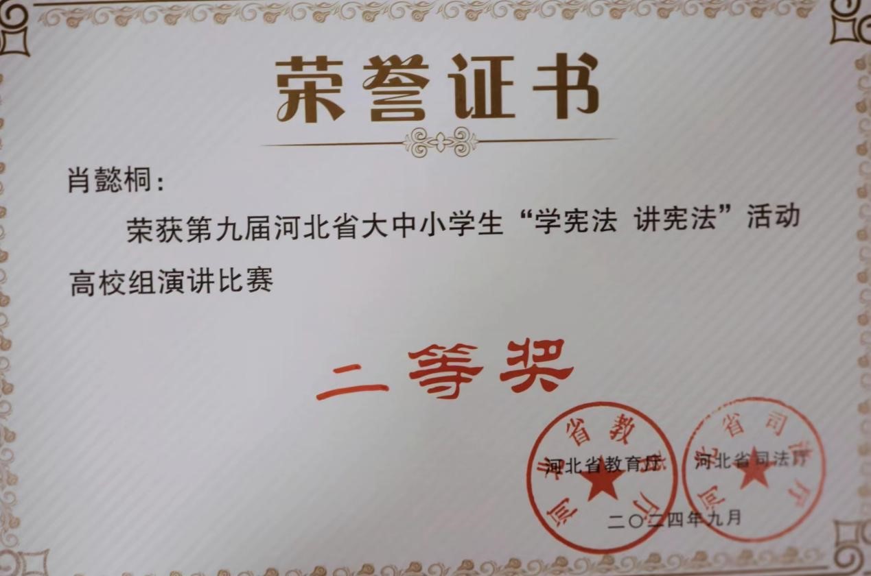 9月26日,由河北省教育厅、河北省司法厅主办,河北师范大学承办的第九届河北省大中小学生“学宪法 讲宪法”大赛暨全国选拔赛在石家庄成功举行。纽约国际官网历史文化与法学系2023级法学专业王鑫璐同学在高校组素养竞赛中荣获二等奖,2024级法学专业肖懿桐同学在高校组演讲比赛中荣获二等奖。