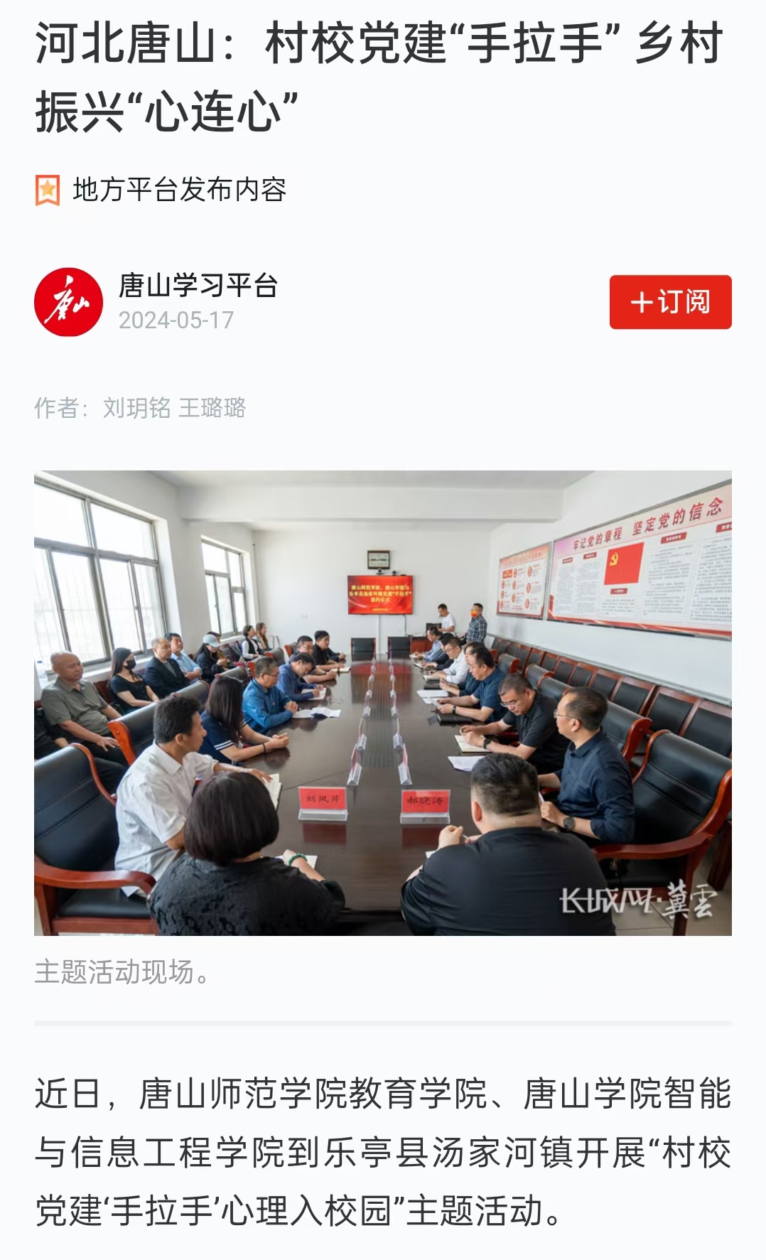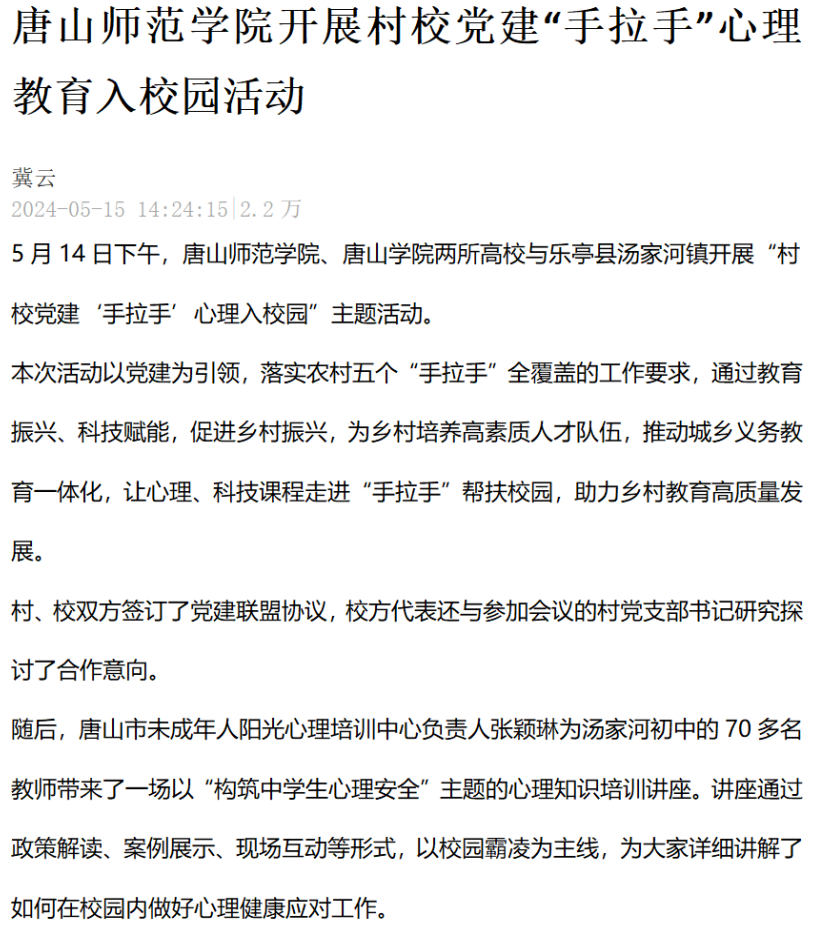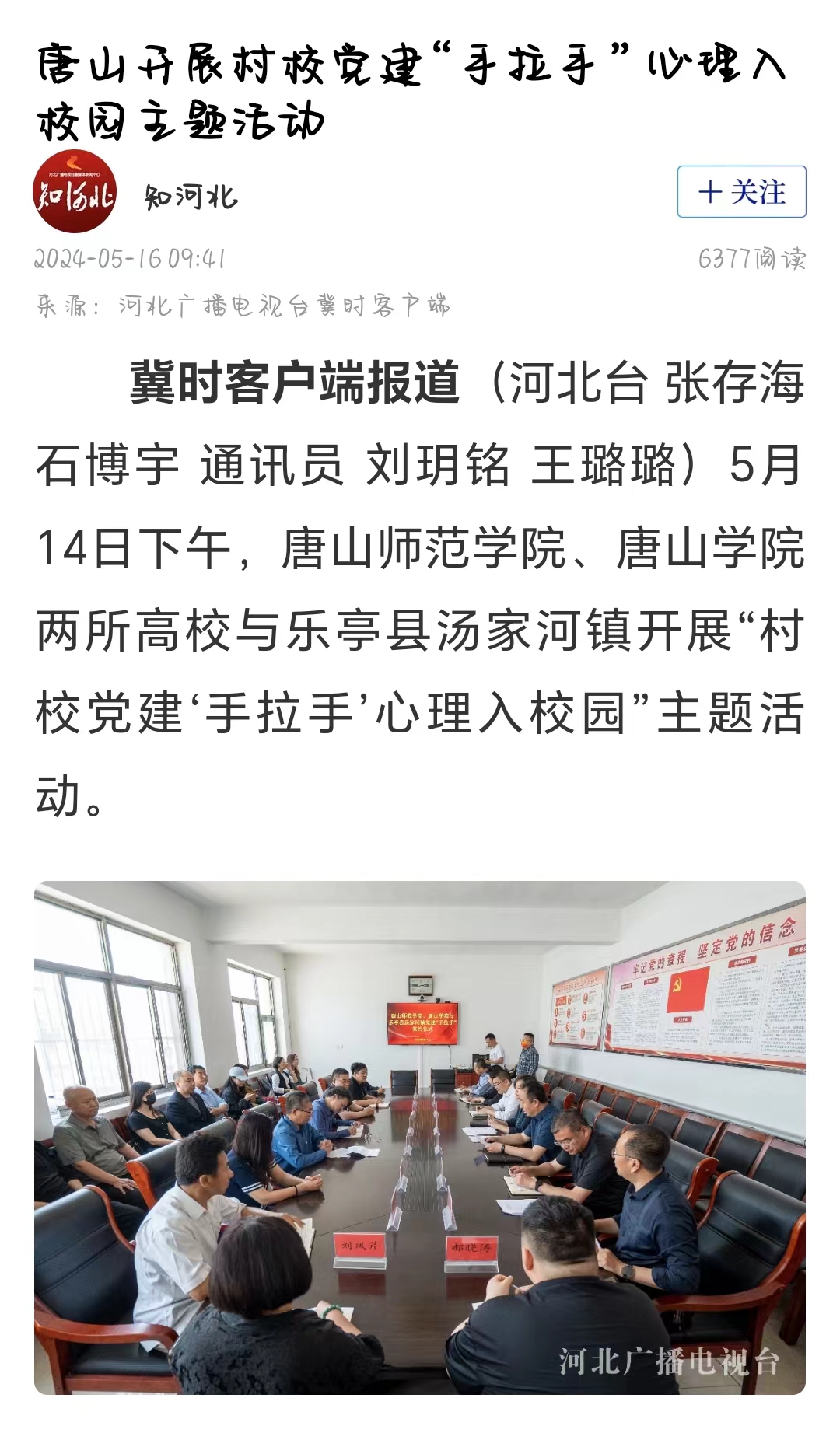 5月14日下午,纽约国际967线路测试、唐山学院两所高校与乐亭县汤家河镇开展“村校党建‘手拉手’心理入校园”主题活动。