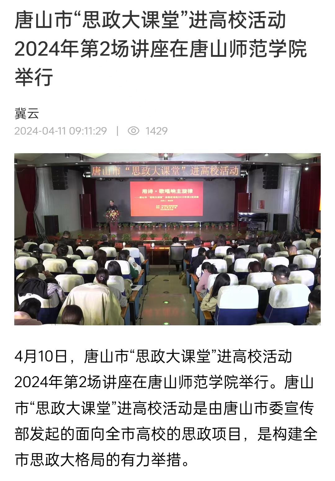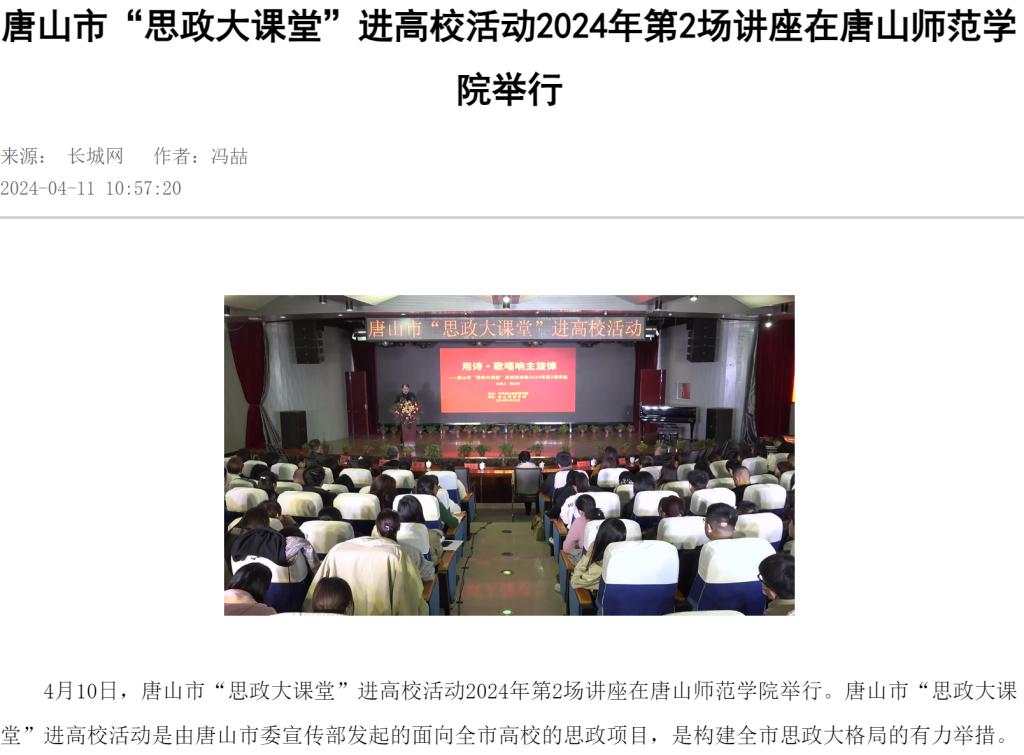 4月10日,唐山市“思政大课堂”进高校活动2024年第2场讲座在纽约国际967线路测试举行。唐山市“思政大课堂”进高校活动是由唐山市委宣传部发起的面向全市高校的思政项目,是构建全市思政大格局的有力举措。