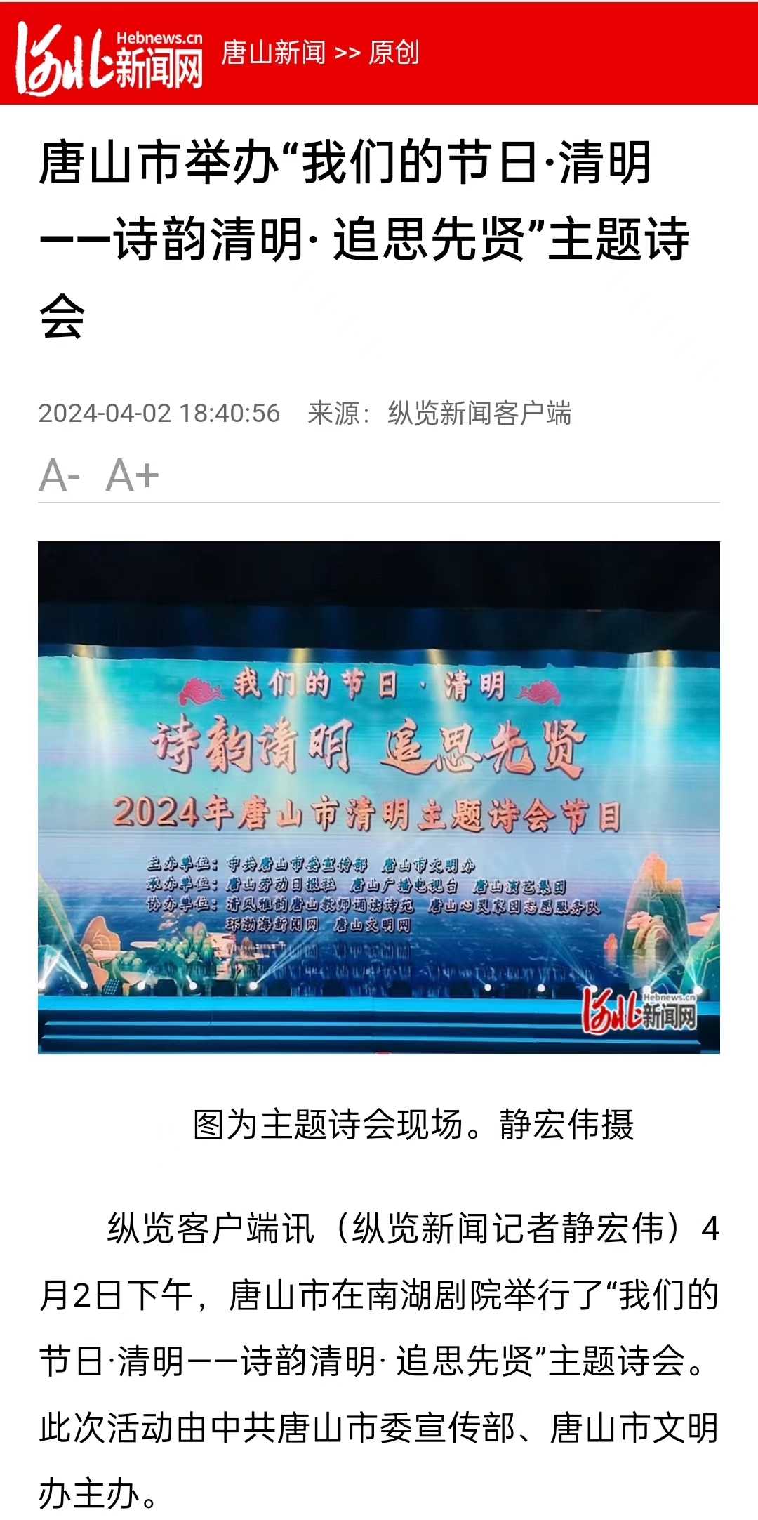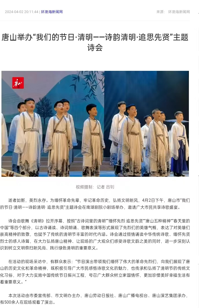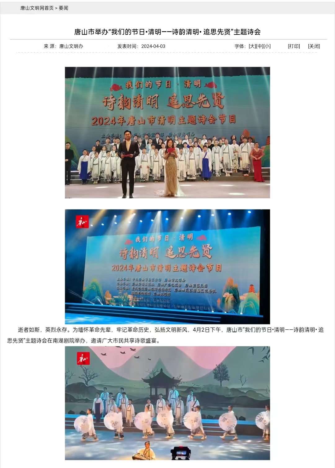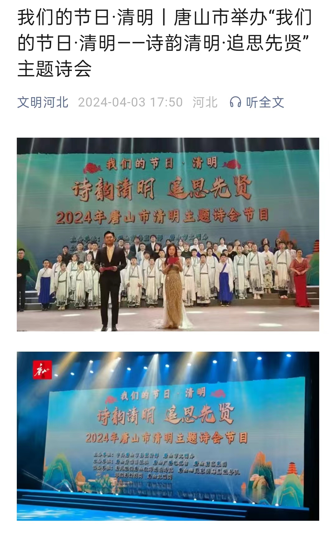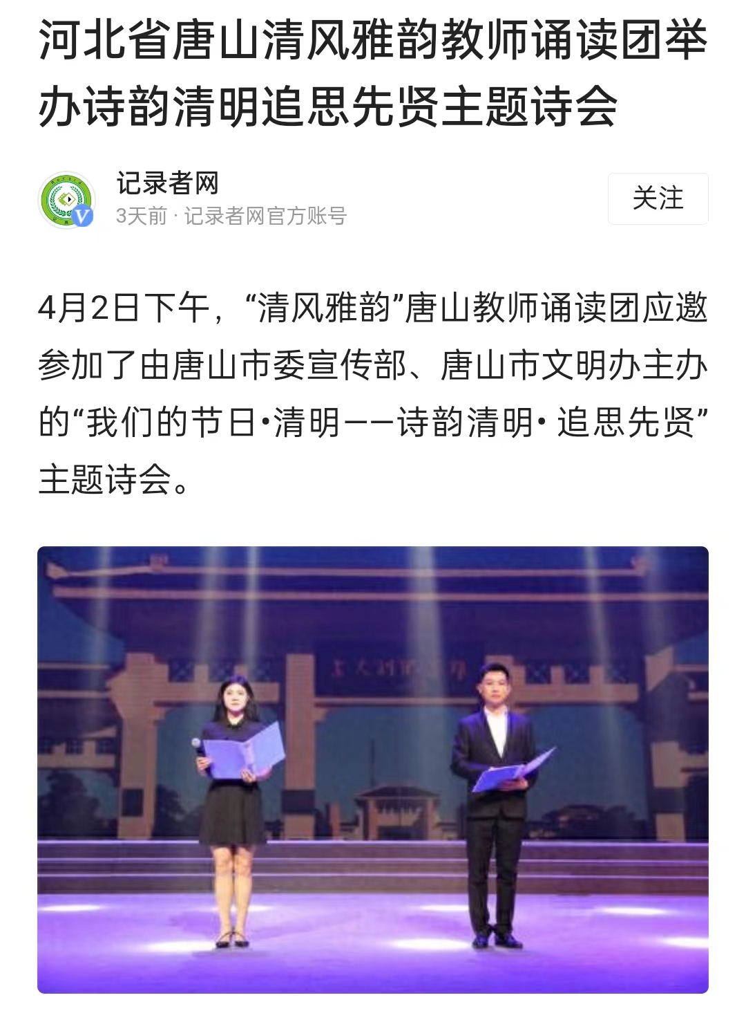唐山“清风雅韵”诵读团奉现了一台精彩纷呈的节目!由唐山市委宣传部、文明办主办的清明诗会,主题显明,格调高雅,有较强的艺术水准和教育意义,产生广泛影响。众多媒体转播和报道,其中,纽约国际官网学生社团带来朗诵作品《感悟清明》。