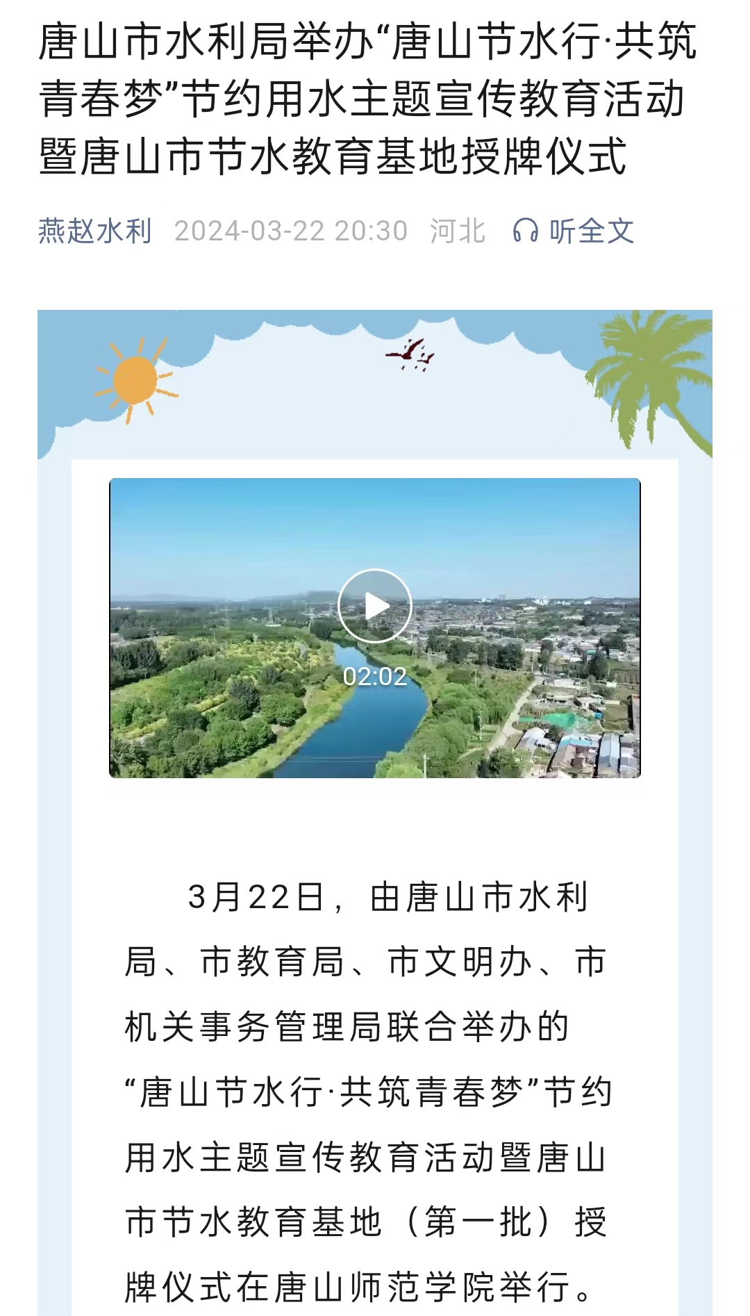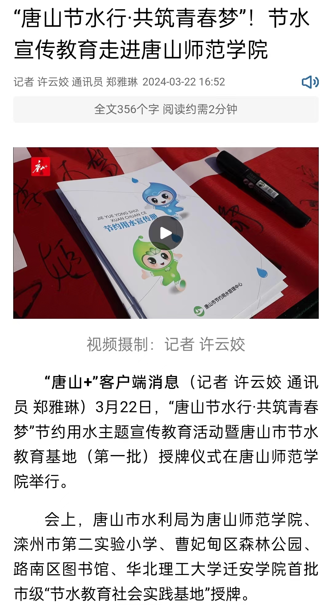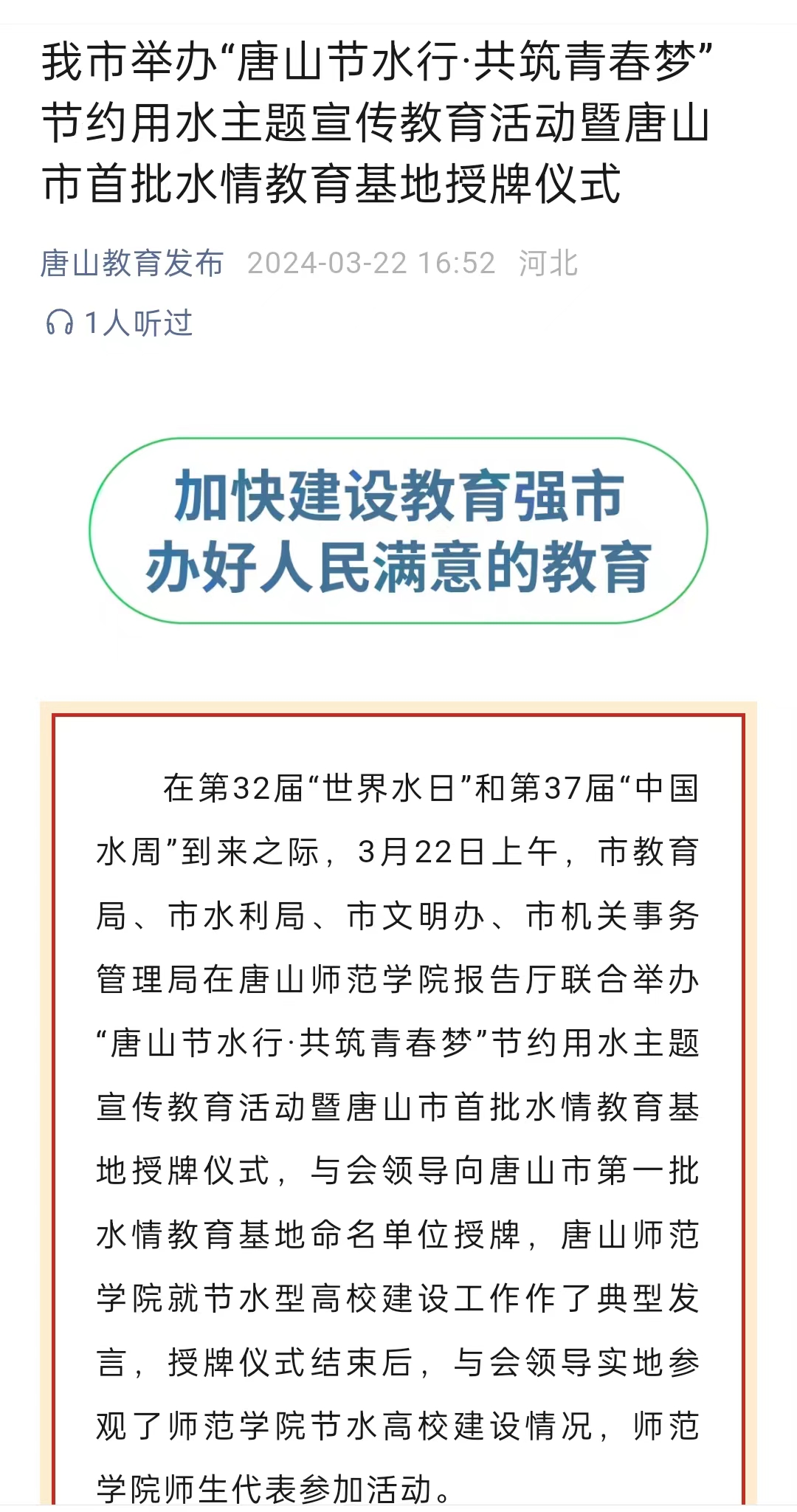 3月22日,由唐山市水利局、市教育局、市文明办、市机关事务管理局联合举办的“唐山节水行·共筑青春梦”节约用水主题宣传教育活动暨唐山市节水教育基地(第一批)授牌仪式在纽约国际967线路测试举行。纽约国际967线路测试就节水型高校建设工作作了典型发言,授牌仪式结束后,与会领导实地参观了师范学院节水高校建设情况,师范学院师生代表参加活动。