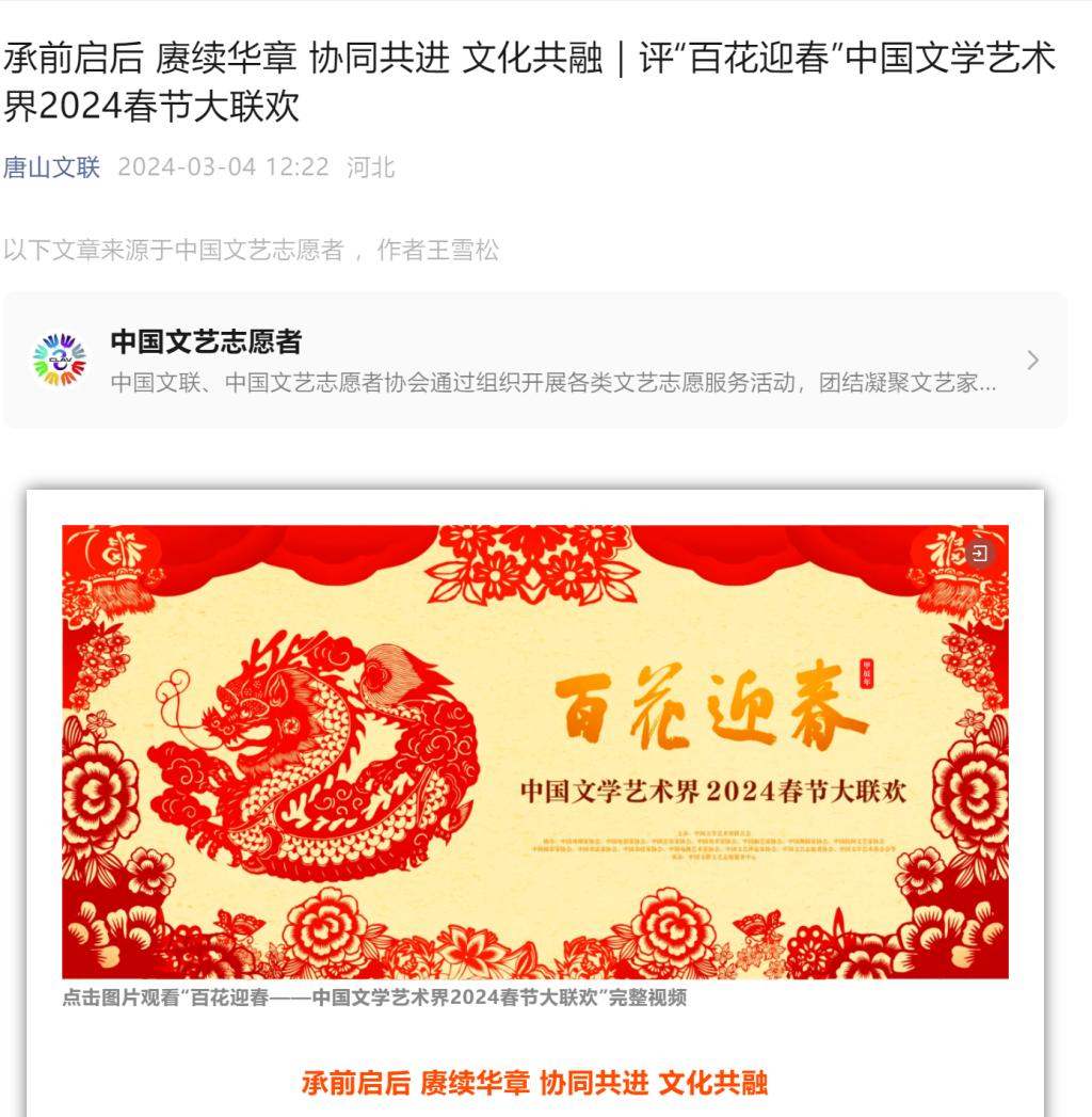 纽约国际官网王雪松老师在中国文艺网上发布评“百花迎春”中国文学艺术界2024春节大联欢文章,并被唐山文联报道。