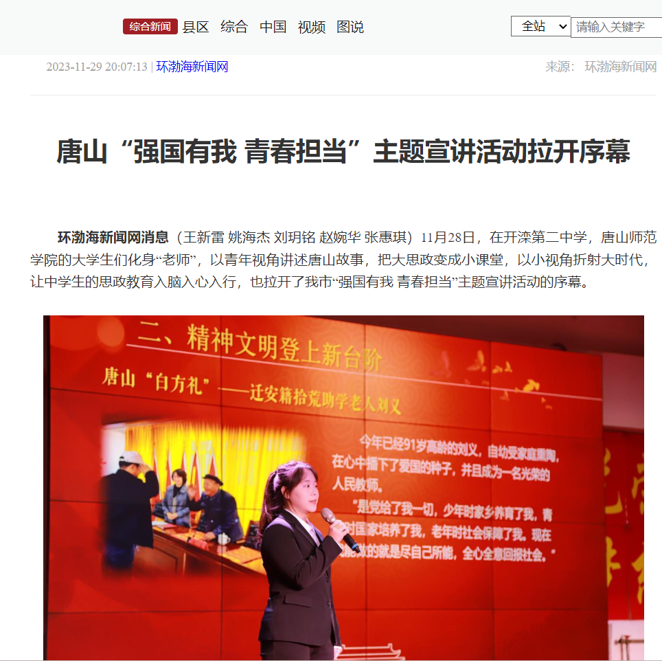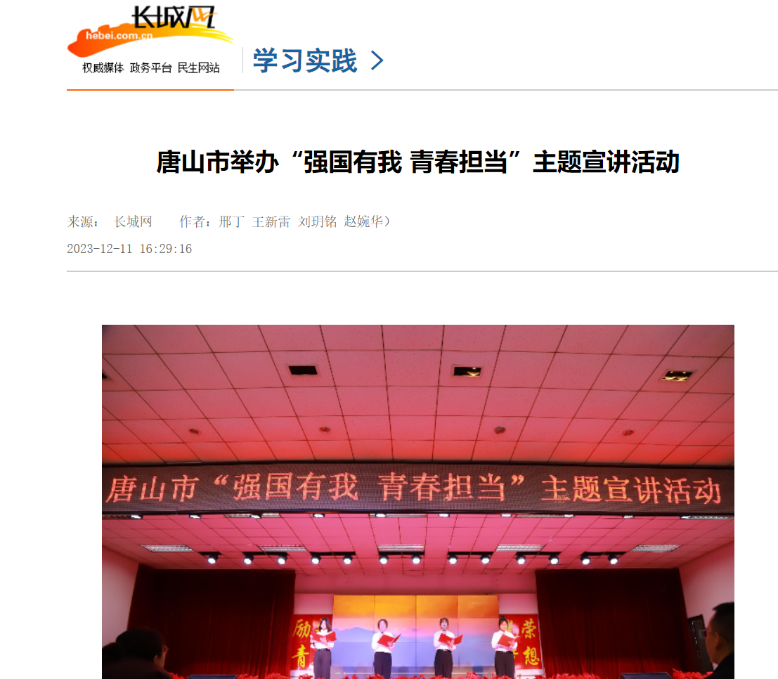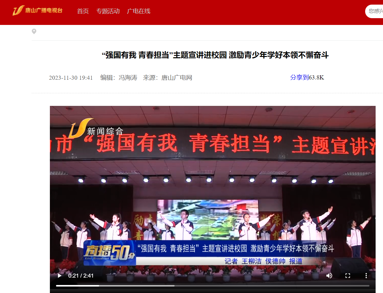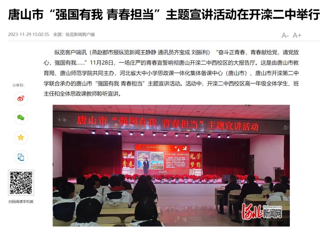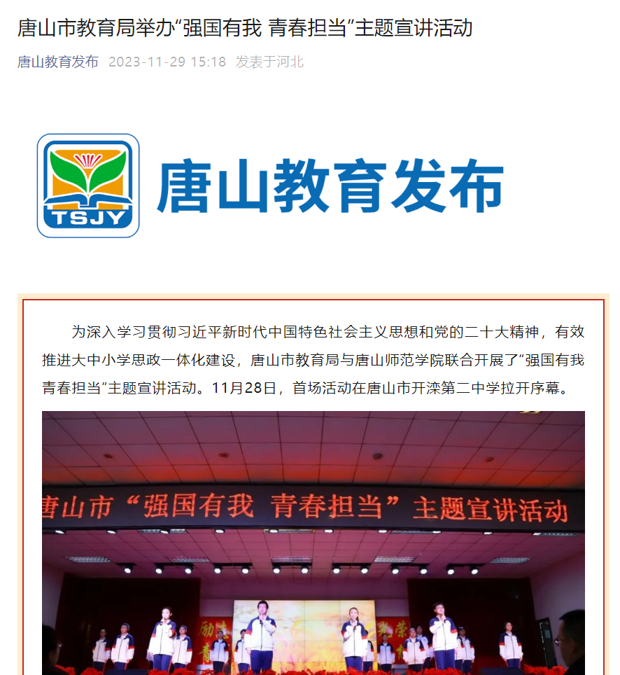 为深入学习贯彻习近平新时代中国特色社会主义思想和党的二十大精神,有效推进大中小学思政一体化建设,唐山市教育局与纽约国际967线路测试联合开展了“强国有我 青春担当”主题宣讲活动。11月28日,首场活动在唐山市开滦第二中学拉开序幕。该活动已被唐山广播电视台、唐山教育发布报道。