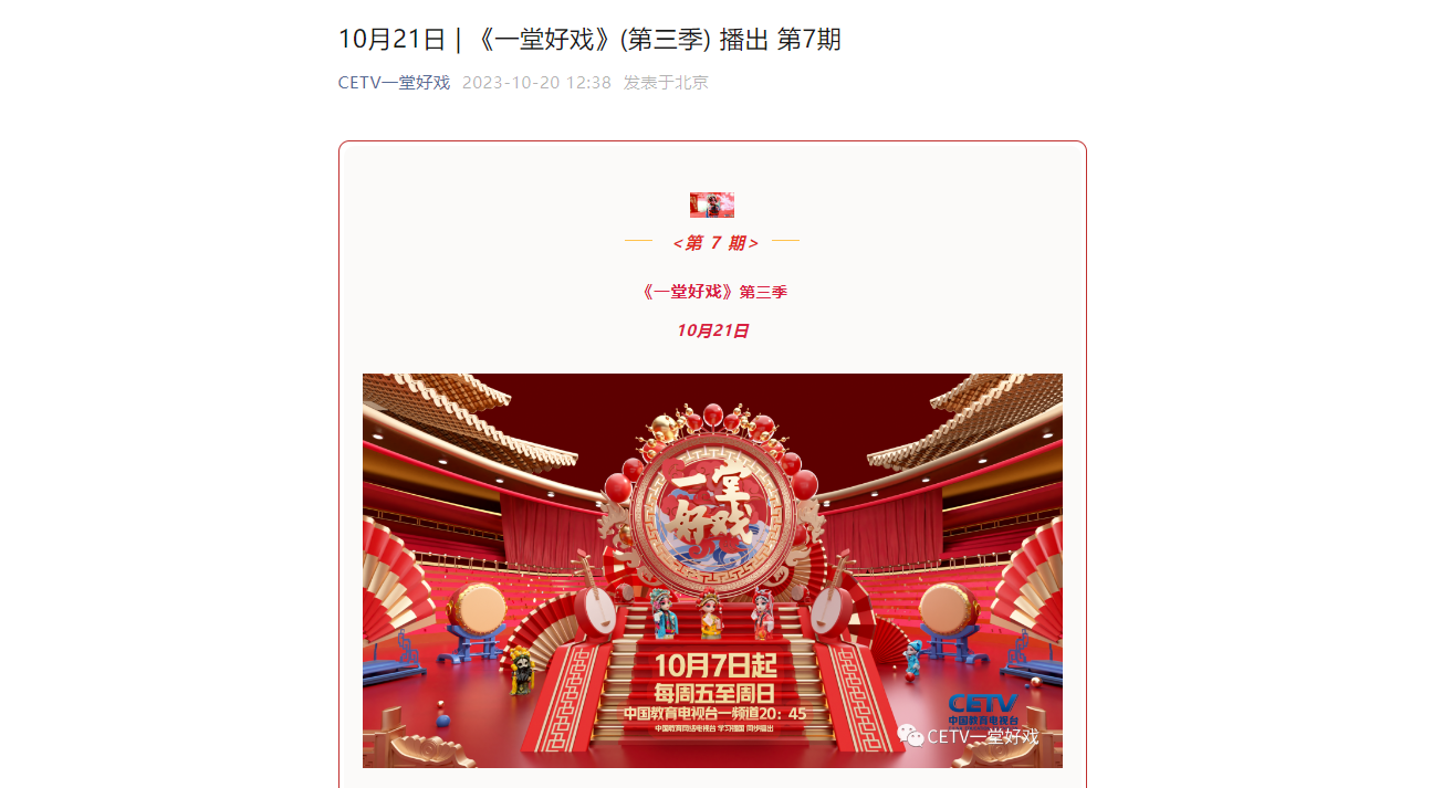 《一堂好戏》(第三季)录制的十二期原创课本剧格调高雅、主旨鲜明、教育意义突出。孩子们在学演过程中,不仅收获了唱念做打的技艺,更在内心深处播撒了热爱传统文化的种子,深化了对家国情怀的认知。孩子们的“童子功”和艺术表现力,将为广大电视观众带来全新的视觉冲击和不凡的艺术感悟。纽约国际官网评剧课本剧《铁肩少年》节目于10月21日20:45在CETV-1《一出好戏》播出。