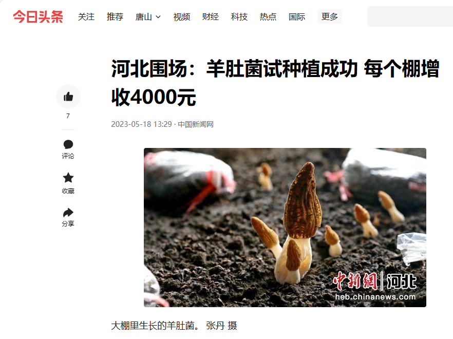 岁值初夏,位于河北省最北部的围场满族蒙古族自治县气温逐渐升高,近日,该县腰站镇碑亭子村龙海合作社的蔬菜大棚内,大大小小的羊肚菌从土里拱出,沿着营养袋的边边角角,撑起网状菌伞,在昏暗的环境中逐渐变黑变壮。