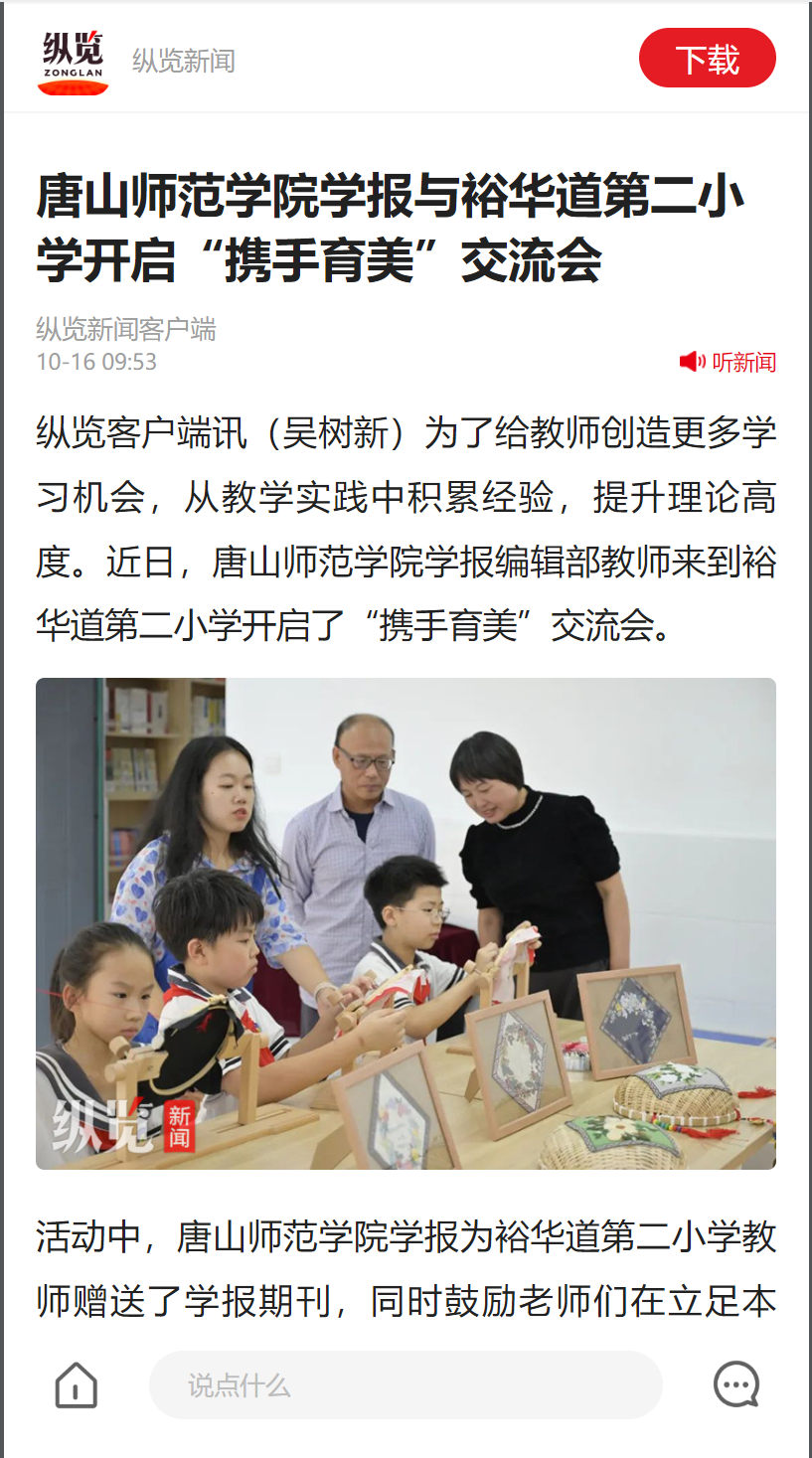 为了给教师创造更多学习机会,从教学实践中积累经验,提升理论高度。近日,纽约国际967线路测试学报编辑部教师来到裕华道第二小学开启了“携手育美”交流会。