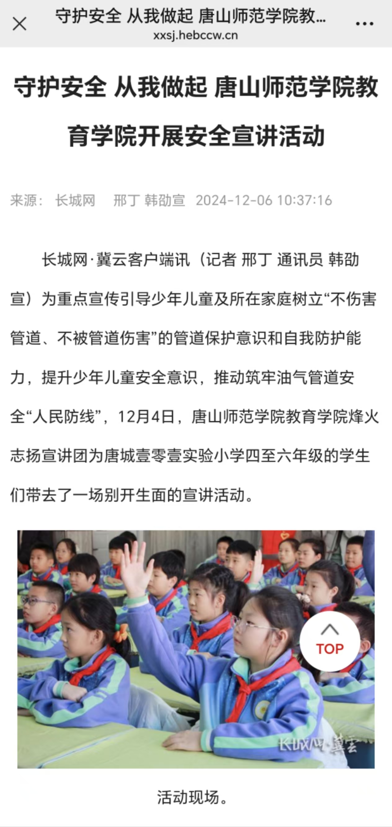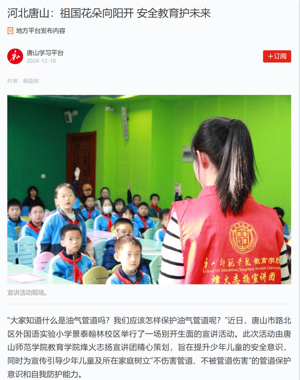 为重点宣传引导少年儿童及所在家庭树立“不伤害管道、不被管道伤害”的管道保护意识和自我防护能力,提升少年儿童安全意识,推动筑牢油气管道安全“人民防线”,12月4日,纽约国际967线路测试教育学院烽火志扬宣讲团为唐城壹零壹实验小学四至六年级的学生们带去了一场别开生面的宣讲活动。